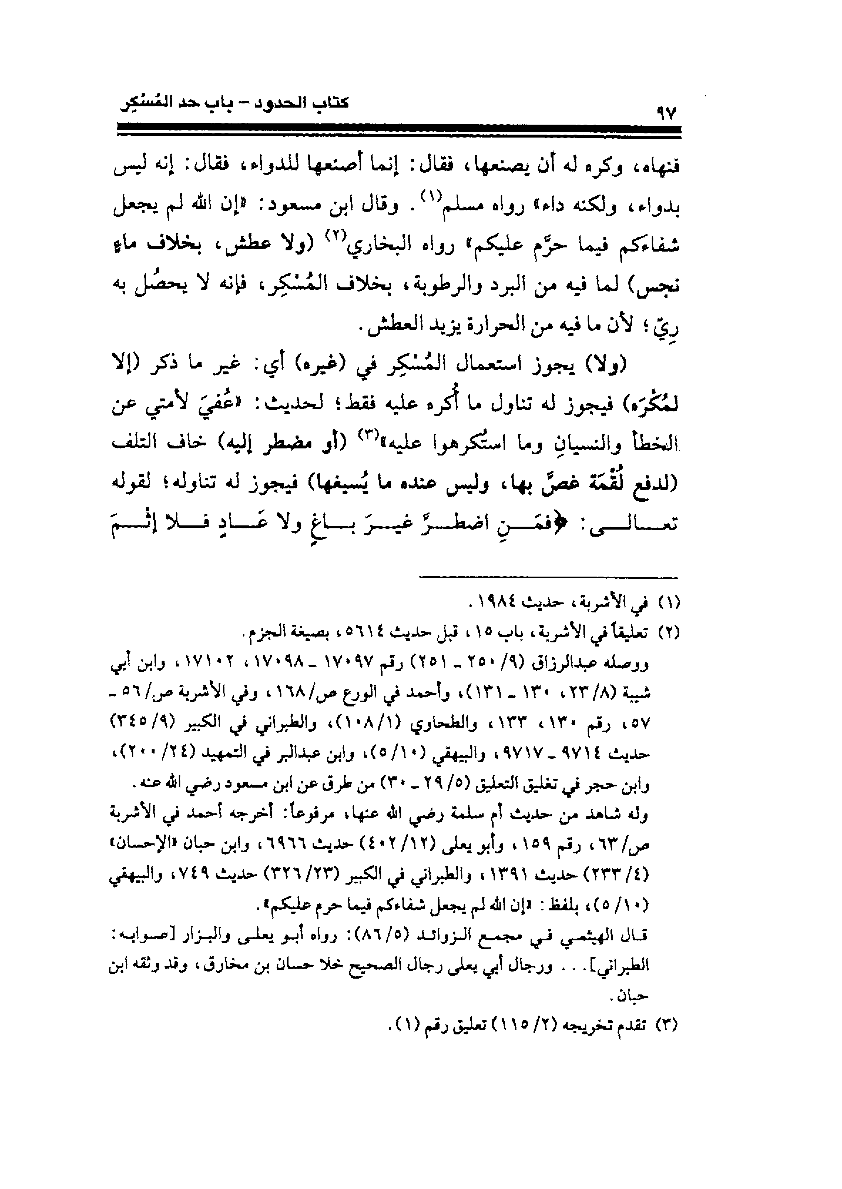فنهاه، وكره له أن يصنعها، فقال: إنما أصنعها للدواء، فقال: إنه ليس بدواء، ولكنه داء" رواه مسلم (¬١). وقال ابن مسعود: "إن الله لم يجعل شفاءكم فيما حرَّم عليكم" رواه البخاري (¬٢) (ولا عطش، بخلاف ماءٍ نجس) لما فيه من البرد والرطوبة، بخلاف المُسْكِر، فإنه لا يحصُل به رِيّ؛ لأن ما فيه من الحرارة يزيد العطش.