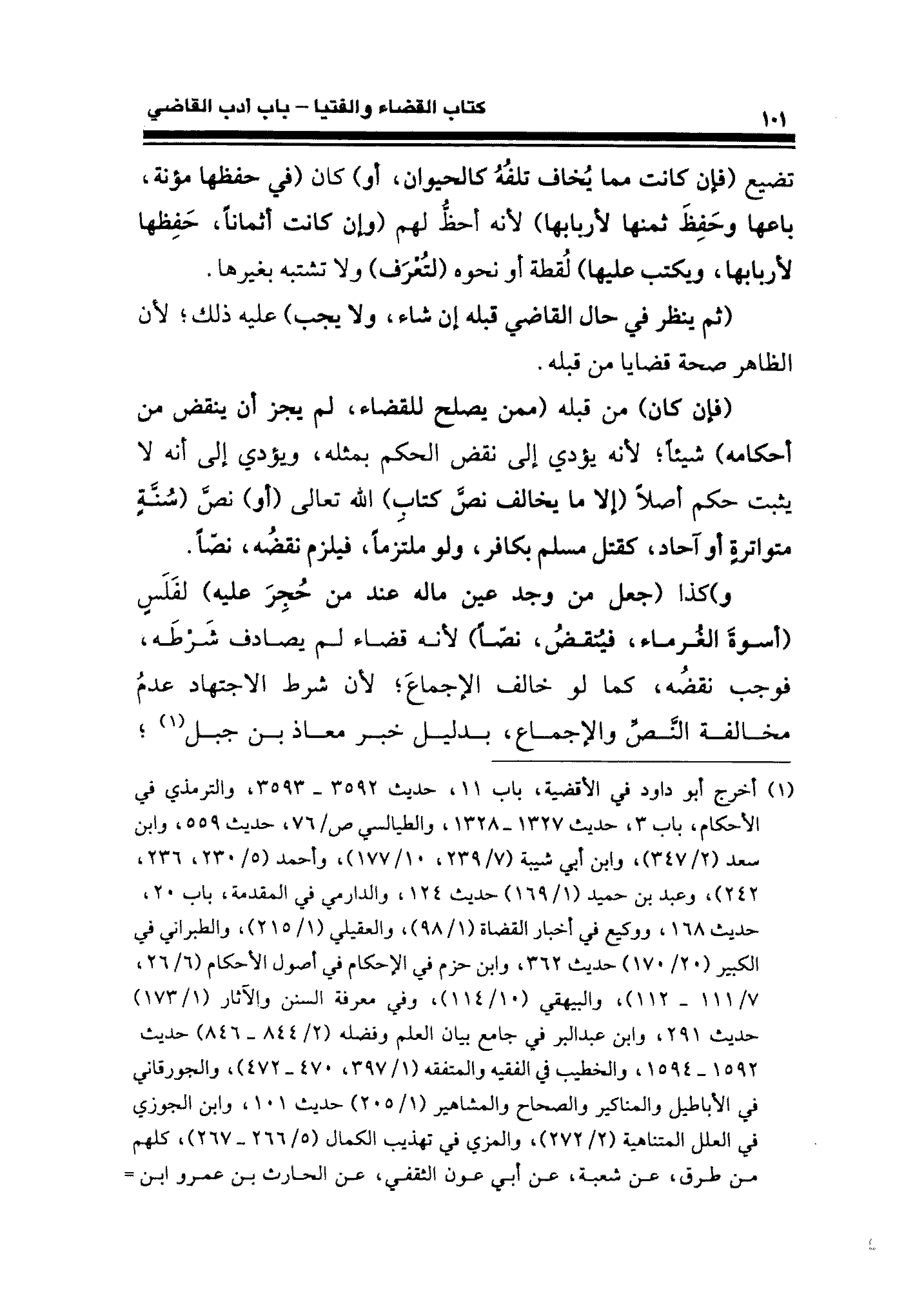 (¬١) أخرج أبو داود في الأقضية، باب ١١، حديث ٣٥٩٢ - ٣٥٩٣، والتِّرمذيّ في الأحكام، باب ٣، حديث ١٣٢٧ - ١٣٢٨، والطيالسي ص/ ٧٦، حديث ٥٥٩، وابن سعد (٢/ ٣٤٧)، وابن أبي شيبة (٧/ ٢٣٩، ١٠/ ١٧٧)، وأَحمد (٥/ ٢٣٠، ٢٣٦، ٢٤٢)، وعبد بن حميد (١/ ١٦٩) حديث ١٢٤. والدارمي في المقدمة، باب ٢٠، حديث ١٦٨، ووكيع في أخبار القضاة (١/ ٩٨)، والعقيلي (١/ ٢١٥) والطبراني في "الكبير" (٢٠/ ١٧٠) حديث ٣٦٢، وابن حزم في الإحكام في أصول الأحكام (٦/ ٢٦، ٧/ ١١١ - ١١٢)، والبيهقي (١٠/ ١١٤)، وفي معرفة السنن والآثار (١/ ١٧٣) حديث ٢٩١، وابن عبد البر في جامع بيان العلم وفضله (٢/ ٨٤٤ - ٨٤٦) حديث ١٥٩٢ - ١٥٩٤، والخطيب في الفقيه والمتفقه (١/ ٣٩٧، ٤٧٠ - ٤٧٢)، والجورقاني في الأباطيل والمناكير والصحاح والمشاهير (١/ ٢٠٥) حديث ١٠١، وابن الجوزي في العلل المتناهية (٢/ ٢٧٢)، والمزي في تهذيب الكمال (٥/ ٢٦٦ - ٢٦٧)، كلهم من طرق، عن شعبة، عن أبي عون الثقفي، عن الحارث بن عمر وابن =