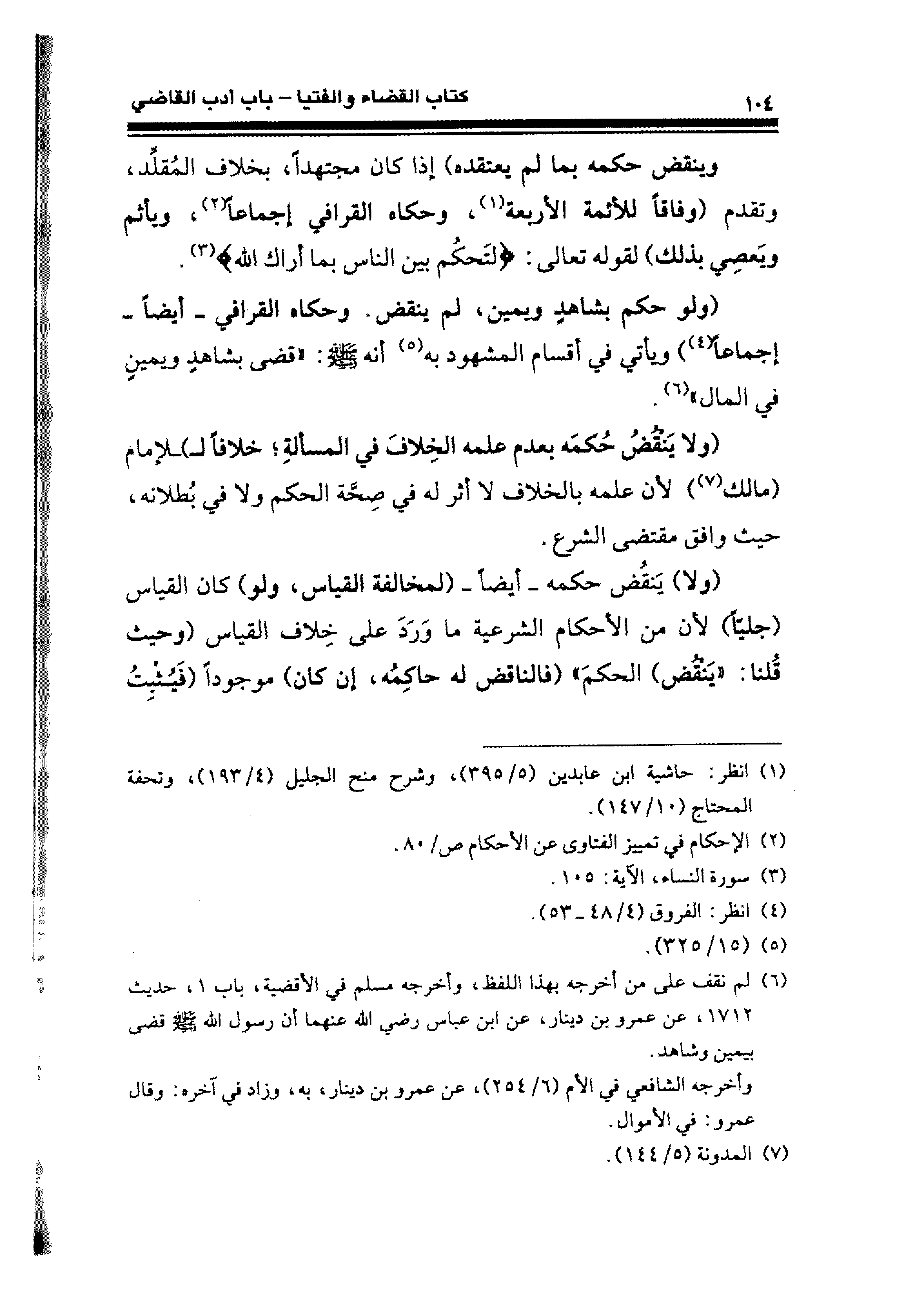 وينقض حكمه بما لم يعتقده) إذا كان مجتهدًا، بخلاف المُقلِّد، وتقدم (وفاقًا للأئمة الأربعة (١)، وحكاه القرافي إجماعًا (¬٢)، ويأثم ويَعصِي بذلك) لقوله تعالى: {لِتَحْكُمَ بَيْنَ النَّاسِ بِمَا أَرَاكَ اللَّهُ} (¬٣).