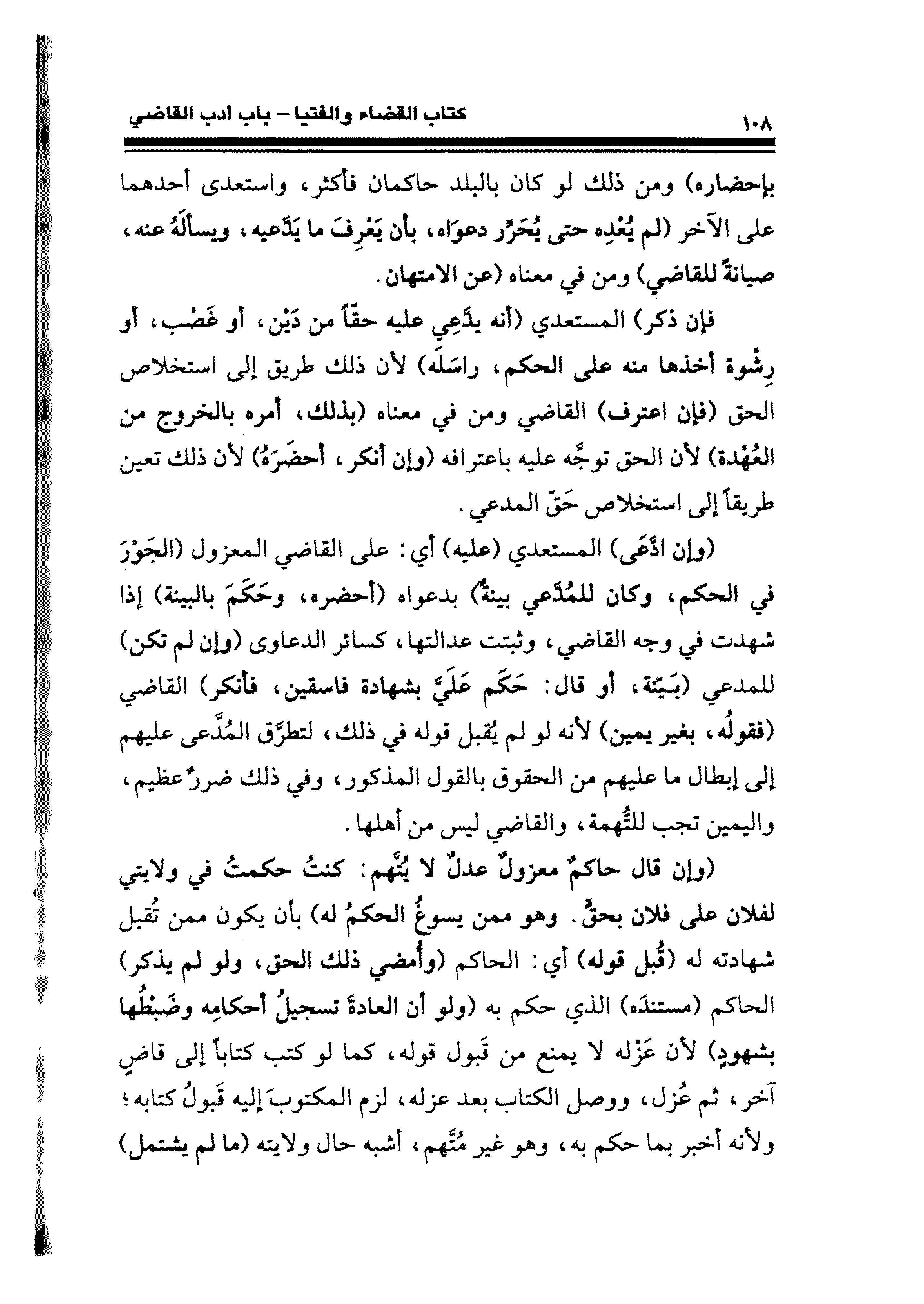 (وإن ادَّعَى) المستعدي (عليه) أي: على القاضي المعزول (الجَوْرَ في الحكم، وكان للمُدَّعي بينةٌ) بدعواه (أحضره، وحَكَمَ بالبينة) إذا شهدت في وجه القاضي، وثبتت عدالتها، كسائر الدعاوى (وإن لم تكن) للمدعي (بَيّنة، أو قال: حَكَم عَلَيَّ بشهادة فاسقين، فأنكر) القاضي (فقولُه، يغير يمين) لأنه لو لم يُقبل قوله في ذلك، لتطرَّق المُدَّعى عليهم إلى إبطال ما عليهم من الحقوق بالقول المذكور، وفي ذلك ضررٌ عظيم، واليمين تجب للتُّهمة، والقاضي ليس من أهلها.