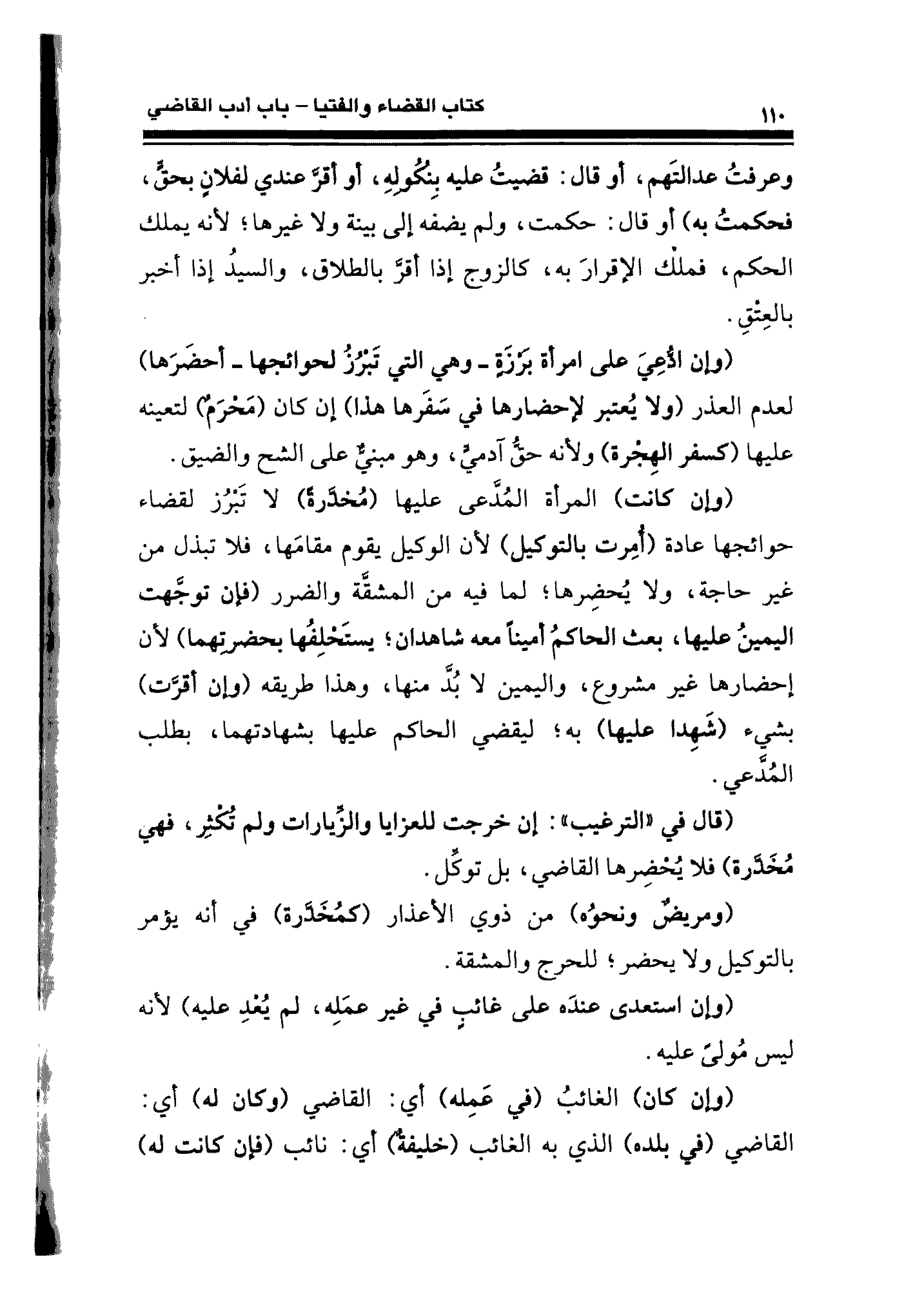 (وإن ادُّعِيَ على امرأة بَرْزةٍ -وهي التي تَبْرُزُ لحوائجها- أحضَرَها) لعدم العذر (ولا يُعتبر لإحضارها في سَفَرها هذا) إن كان (مَحْرَمٌ) لتعينه عليها (كسفر الهِجْرة) ولأنه حقُّ آدميٍّ، وهو مبنيٌّ على الشح والضيق.