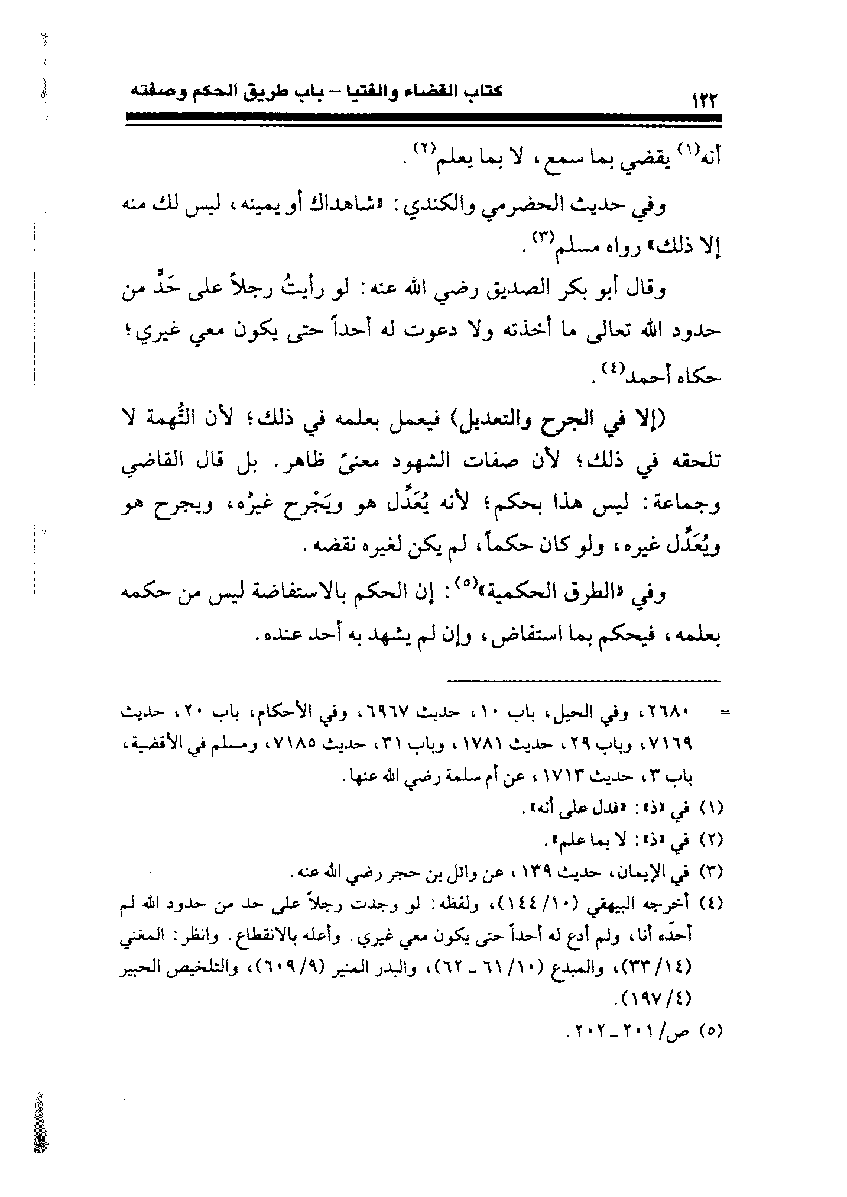 وقال أبو بكر الصديق رضي الله عنه: لو رأيتُ رجلًا على حَدٍّ من حدود الله تعالى ما أخذته ولا دعوت له أحدًا حتَّى يكون معي غيري؛ حكاه أَحْمد (¬٤).