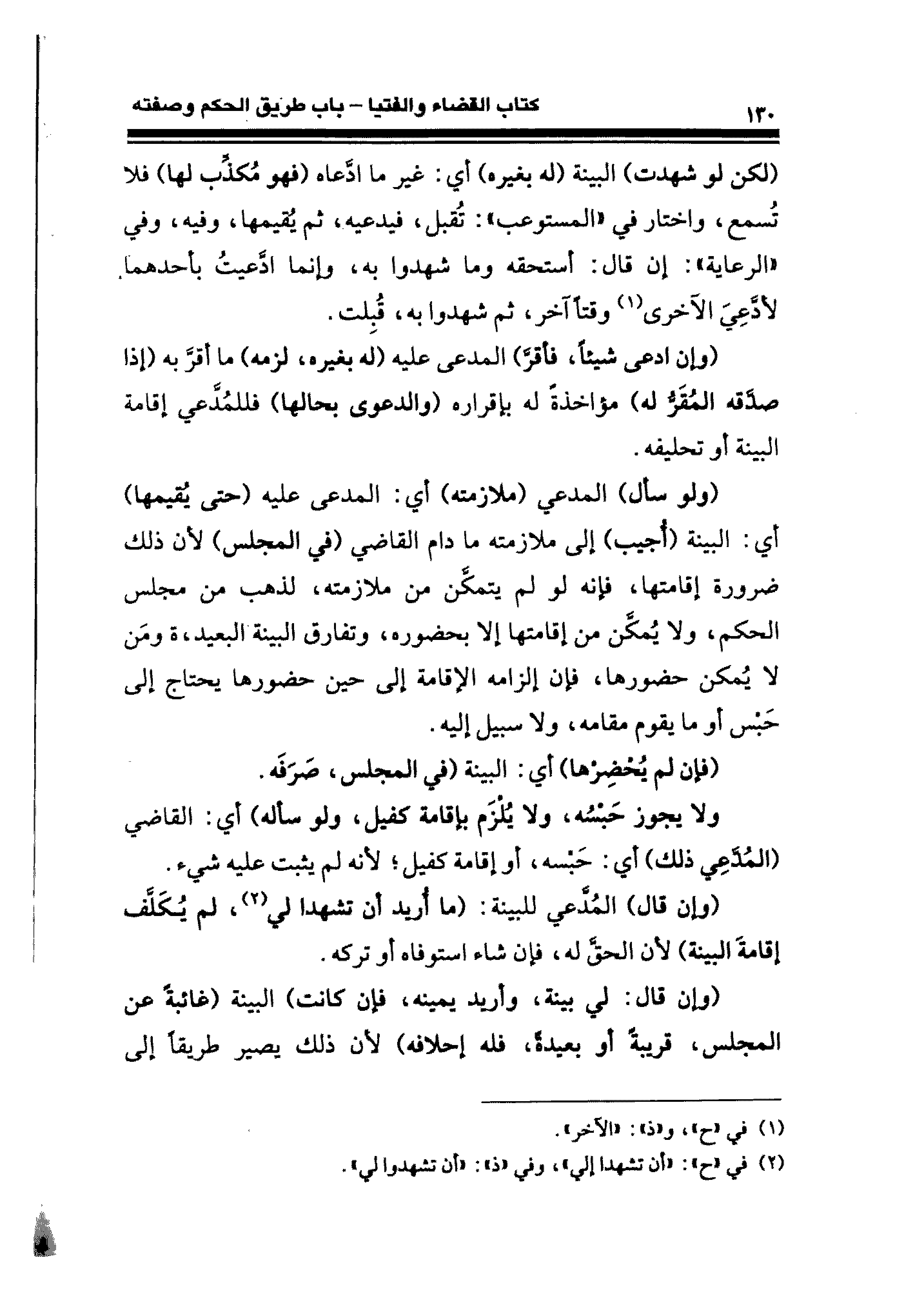 (ولو سأل) المدعي (ملازمته) أي: المدعى عليه (حتَّى يُقيمها) أي: البينة (أُجيب) إلى ملازمته ما دام القاضي (في المجلس) لأن ذلك ضرورة إقامتها، فإنَّه لو لم يتمكَّن من ملازمته، لذهب من مجلس الحكم، ولا يُمكَّن من إقامتها إلَّا بحضوره، وتفارق البينة البعيدة، ومَن لا يُمكن حضورها، فإن إلزامه الإقامة إلى حين حضورها يحتاج إلى حَبْس أو ما يقوم مقامه، ولا سبيل إليه.