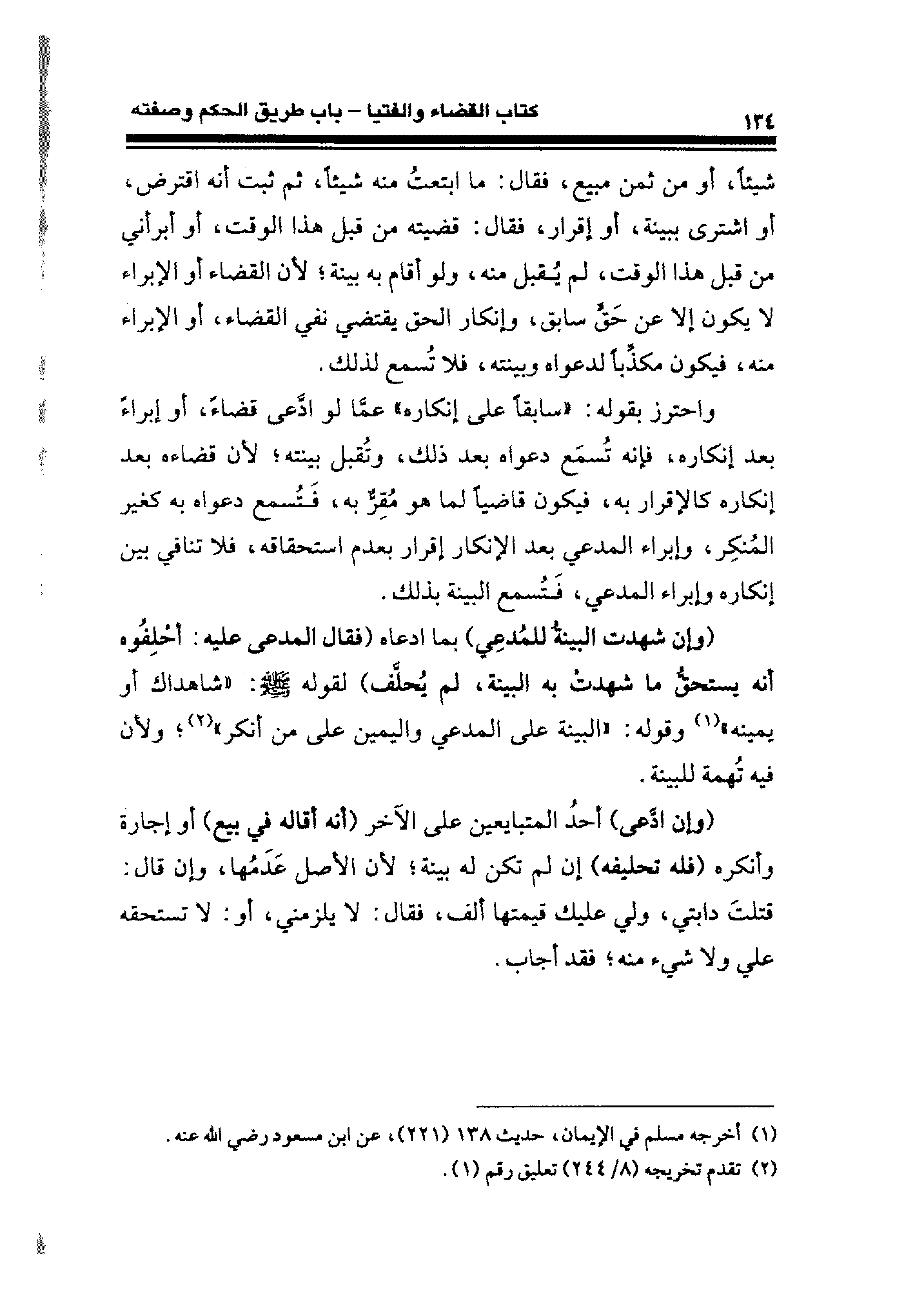 واحترز بقوله: "سابقًا على إنكاره" عما لو ادعى قضاءً، أو إبراءً بعد انكاره، فإنه تسمَع دعواه بعد ذلك، وتقبل بينته؛ لأن قضاءه بعد إنكاره كالإقرار به، فيكون قاضيًا لما هو مُقِر به، فَتسمع دعواه به كغير المنكر، وإبراء المدعي بعد الإنكار إقرار بعدم استحقاقه، فلا تنافي بين إنكاره وإبراء المدعي، فَتُسمع البينة بذلك.