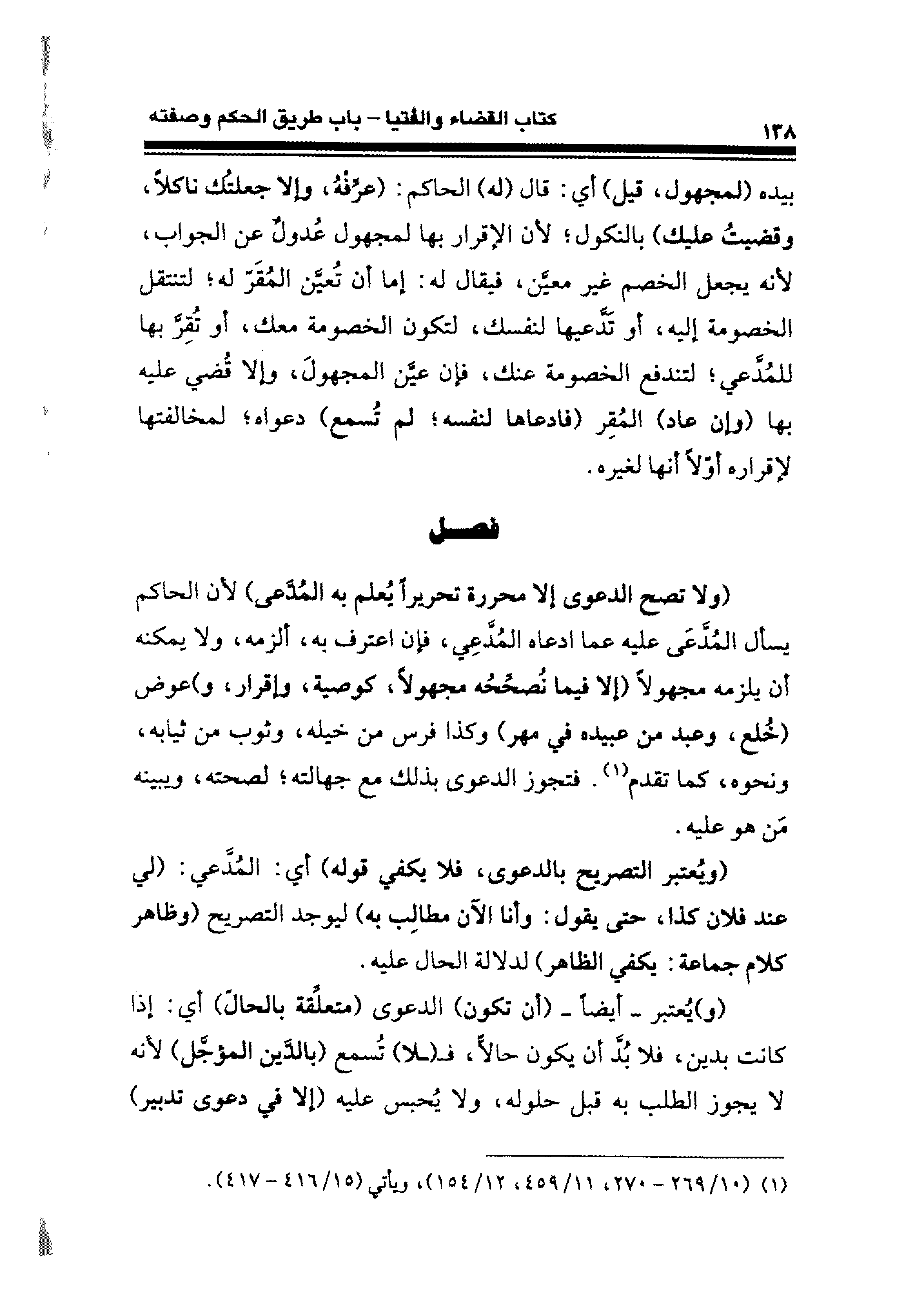 (ولا تصح الدعوى إلا محررة تحريرًا يعلم به المُدَّعى) لأن الحاكم يسأل المُدَّعَى عليه عما ادعاه المُدَّعِي، فإن اعترف به، ألزمه، ولا يمكنه أن يلزمه مجهولًا (إلا فيما نُصحّحُه مجهولًا، كوصية، وإقرار، و) عوض (خُلع، وعبد من عبيده في مهر) وكذا. فرس من خيله، وثوب من ثيابه، ونحوه، كما تقدم (¬١). فتجوز الدعوى بذلك مع جهالته؛ لصحته، ويبينه مَن هو عليه.