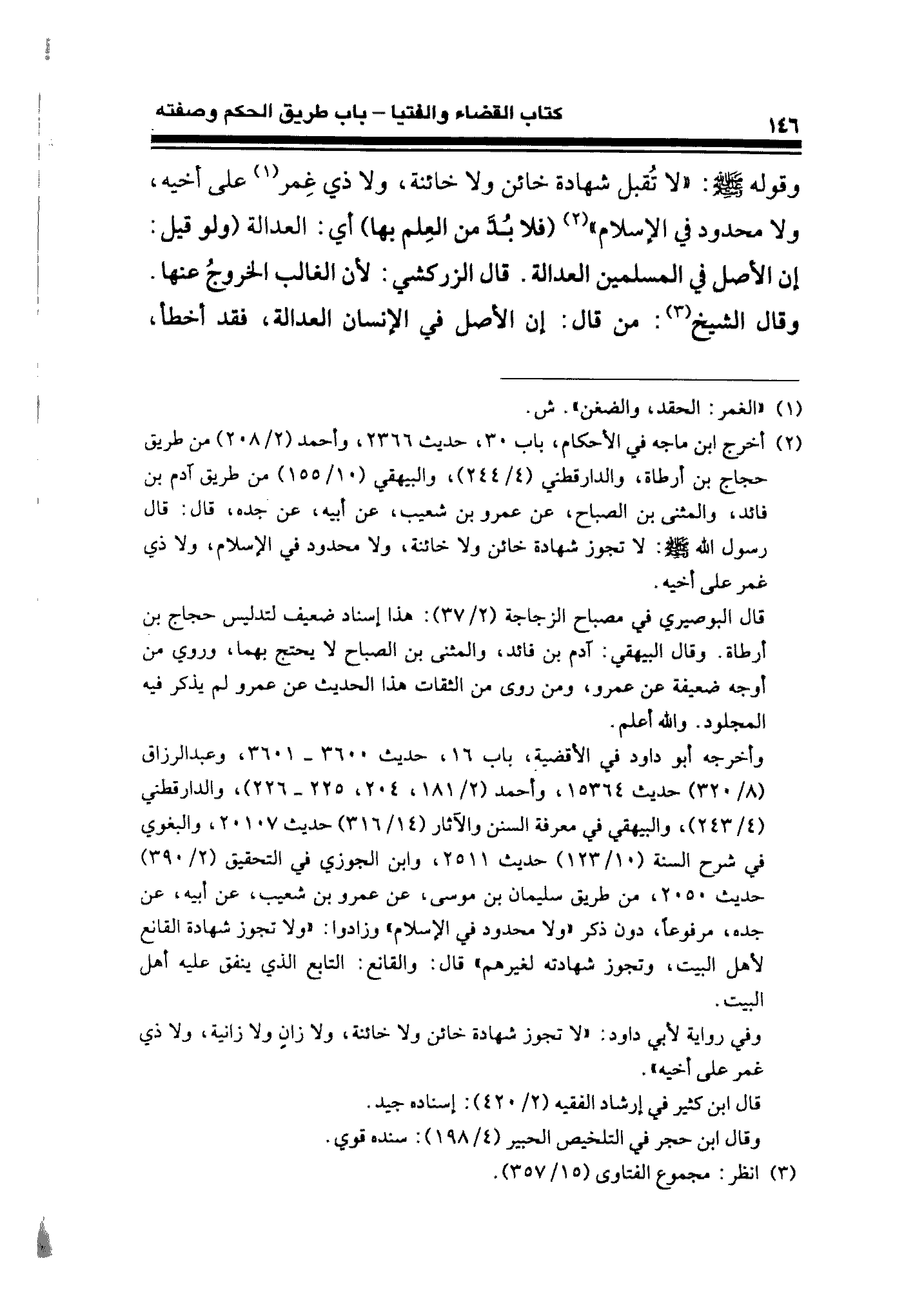 (¬٢) أخرج ابن ماجه في الأحكام، باب ٣٠، حديث ٢٣٦٦، وأحمد (٢/ ٢٠٨) من طريق حجاج بن أرطاة، والدارقطني (٤/ ٢٤٤)، والبيهقي (١٠/ ١٥٥) من طريق آدم بن فائد، والمثنى بن الصباح، عن عمرو بن شعيب، عن أبيه، عن جده: قال: قال رسول الله - صلى الله عليه وسلم -: لا تجوز شهادة خائن ولا خائنة، ولا محدود في الإسلام، ولا ذي غمر على أخيه.