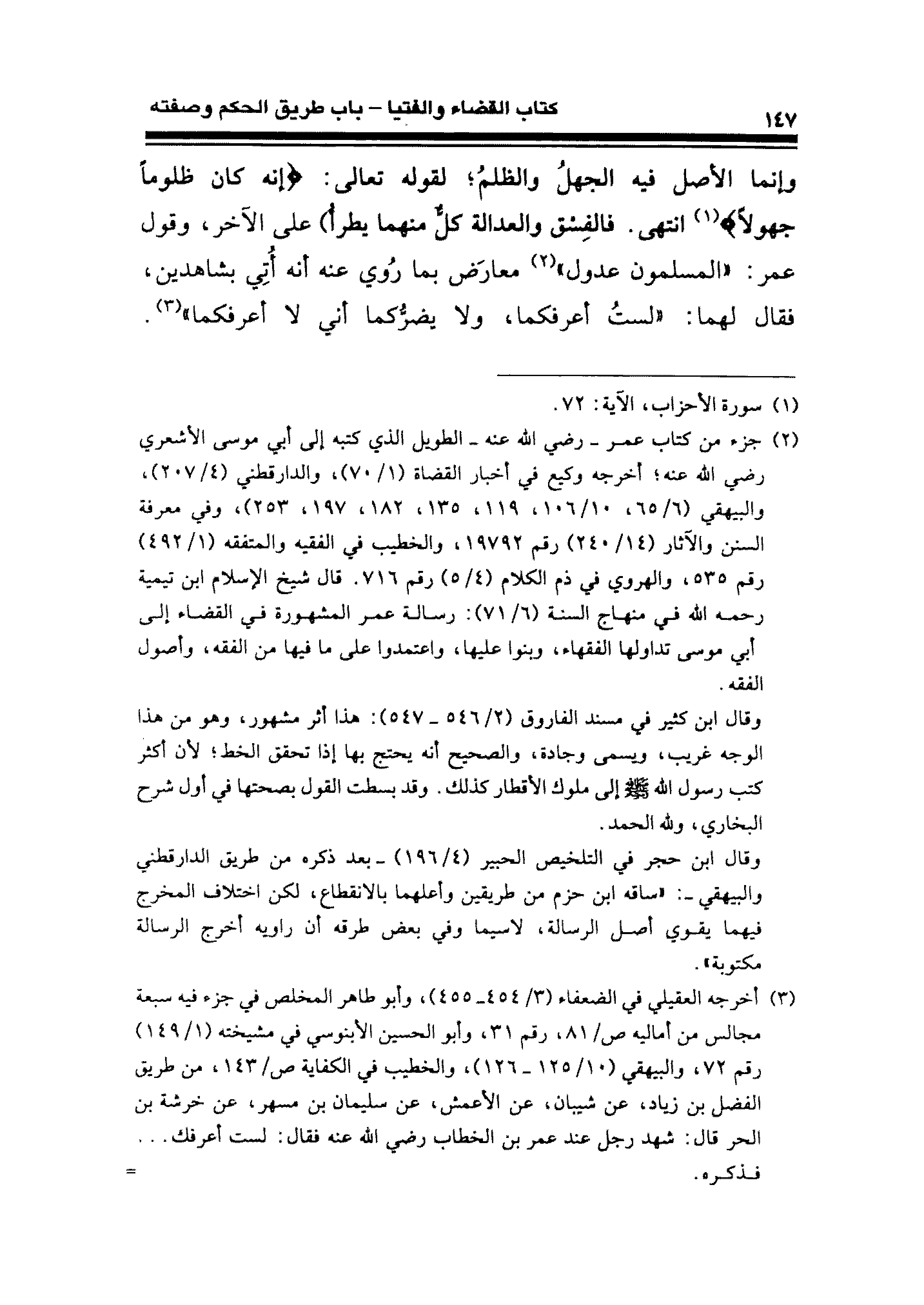 (¬٢) جزء من كتاب عمر -رضي الله عنه- الطويل الَّذي كتبه إلى أبي موسى الأشعري رضي الله عنه؛ أخرجه وكيع بن أخبار القضاة (١/ ٧٠)، والدارقطني (٤/ ٢٠٧)، والبيهقي (٦/ ٦٥، ١٠/ ١٠٦، ١١٩، ١٣٥، ١٨٢، ١٩٧، ٢٥٣)، وفي معرفة السنن والآثار (١٤/ ٢٤٥) رقم ١٩٧٩٢، والخطيب في الفقيه والمتفقه (١/ ٤٩٢) رقم ٥٣٥، والهروي في ذم الكلام (٤/ ٥) رقم ٧١٦. قال شيخ الإسلام ابن تيمية رحمه الله في منهاج السنة (٦/ ٧١): رسالة عمر المشهورة في القضاء إلى أبي موسى تداولها الفقهاء، وبنوا عليها، واعتمدوا على ما فيها عن الفقه، وأصول الفقه.