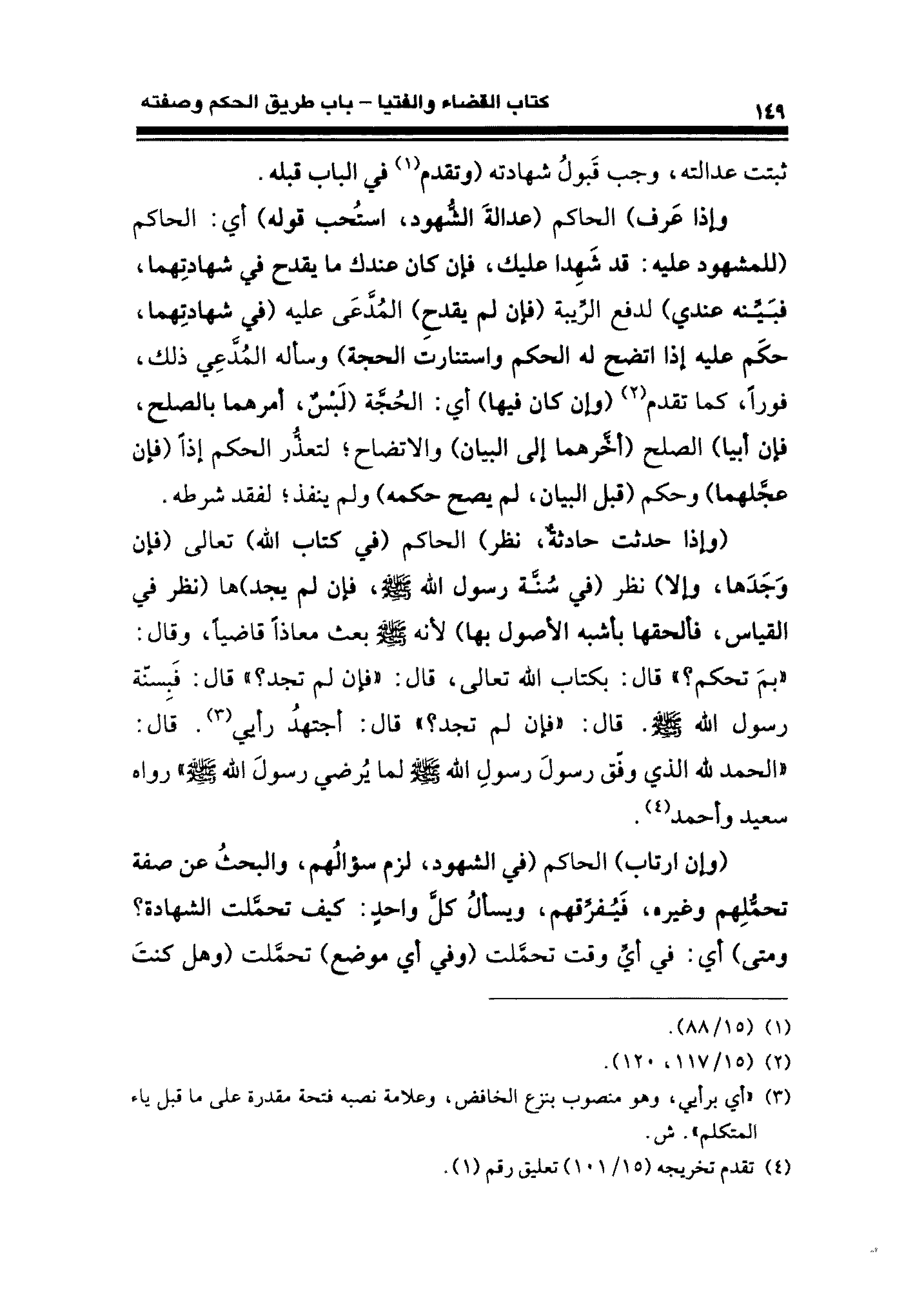 (وإذا حدثت حادثةٌ، نظر) الحاكم (في كتاب الله) تعالى (فإن وَجَدَها، وإلا) نظر (في سُنَّة رسول الله - صلى الله عليه وسلم -، فإن لم يجد) ها (نظر في القياس، فألحقها بأشبه الأصول بها) لأنه - صلى الله عليه وسلم - بعث معاذًا قاضيًا، وقال: "بمَ تحكم؟ " قال: بكتاب الله تعالى، قال: " فإن لم تجد؟ " قال: فَبِسنّة رسول الله - صلى الله عليه وسلم -. قال: "فإن لم تجد؟ " قال: أجتهدُ رأيي (¬٣). قال: "الحمد لله الَّذي وفق رسولَ رسولِ الله - صلى الله عليه وسلم - لما يُرضي رسولَ الله - صلى الله عليه وسلم - " رواه سعيد وأحمد (¬٤).
