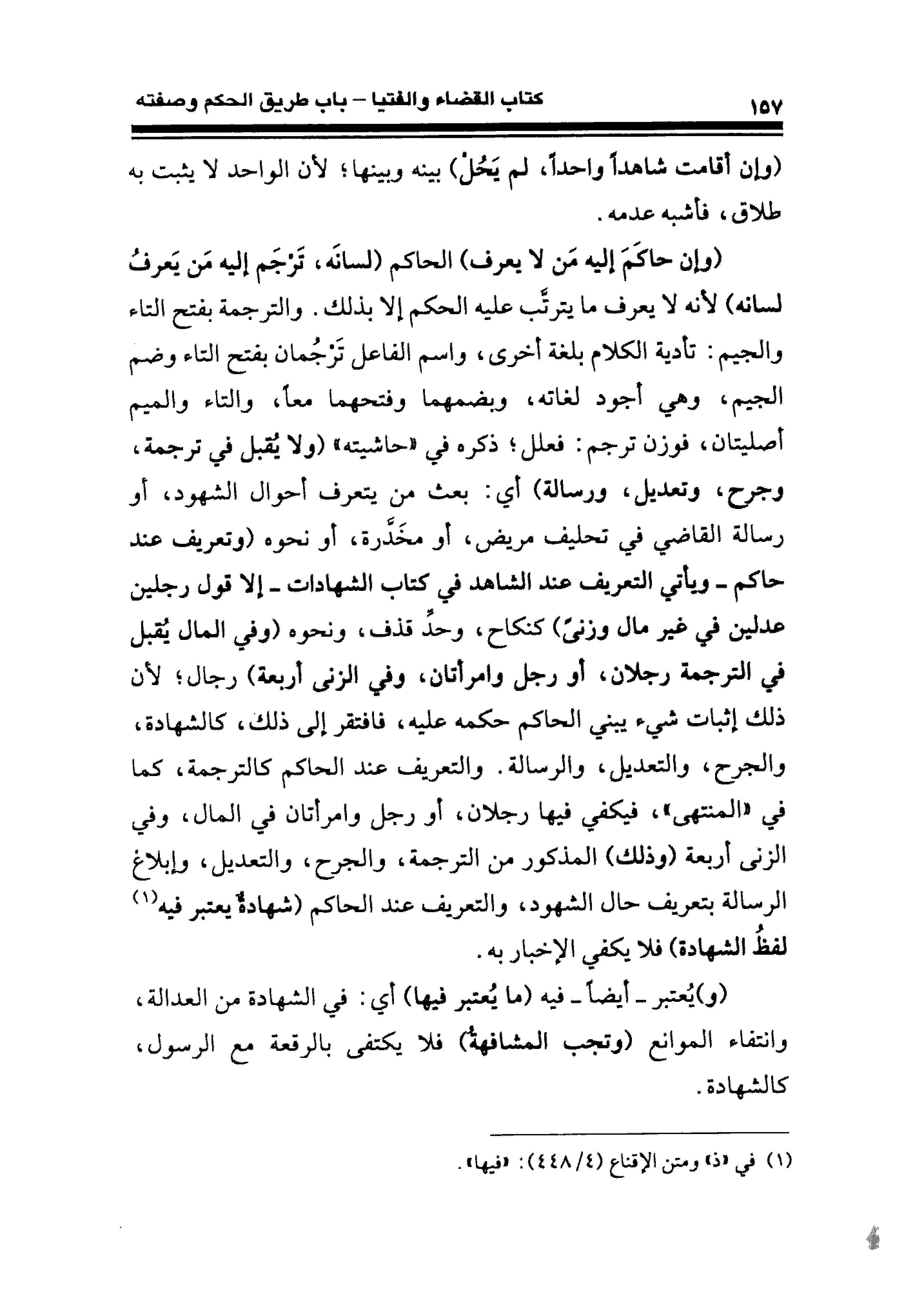 (وإن حاكَمَ إليه مَن لا يعرف) الحاكم (لسانَه، تَرْجَم إليه مَن يَعرفُ لسانه) لأنه لا يعرف ما يترتَّب عليه الحكم إلا بذلك. والترجمة بفتح التاء والجيم: تأدية الكلام بلغة أخرى، واسم الفاعل تَرْجُمان بفتح التاء وضم الجيم، وهي أجود لغاته، وبضمهما وفتحهما معًا، والتاء والميم أصليتان، فوزن ترجم: فعلل؛ ذكره في "حاشيته" (ولا يُقبل فى ترجمة، وجرح، وتعديل، ورسالة) أي: بعث من يتعرف أحوال الشهود، أو رسالة القاضي فى تحليف مريض، أو مخَدَّرة، أو نحوه (وتعريف عند حاكم -ويأتي التعريف عند الشاهد في كتاب الشهادات- إلا قول رجلين عدلين في غير مال وزنىً) كنكاح، وحدِّ قذف، ونحوه (وفي المال يُقبل في الترجمة رجلان، أو رجل وامرأتان، وفي الزنى أربعة) رجال؛ لأن ذلك إثبات شيء يبني الحاكم حكمه عليه، فافتقر إلى ذلك، كالشهادة، والجرح، والتعديل، والرسالة. والتعريف عند الحاكم كالترجمة، كما في "المنتهى"، فيكفي فيها رجلان، أو رجل وامرأتان في المال، وفي الزنى أربعة (وذلك) المذكور من الترجمة، والجرح، والتعديل، وإبلاغ الرسالة بتعريف حال الشهود، والتعريف عند الحاكم (شهادةٌ يعتبر فيه (¬١) لفظُ الشهادة) فلا يكفي الإخبار به.