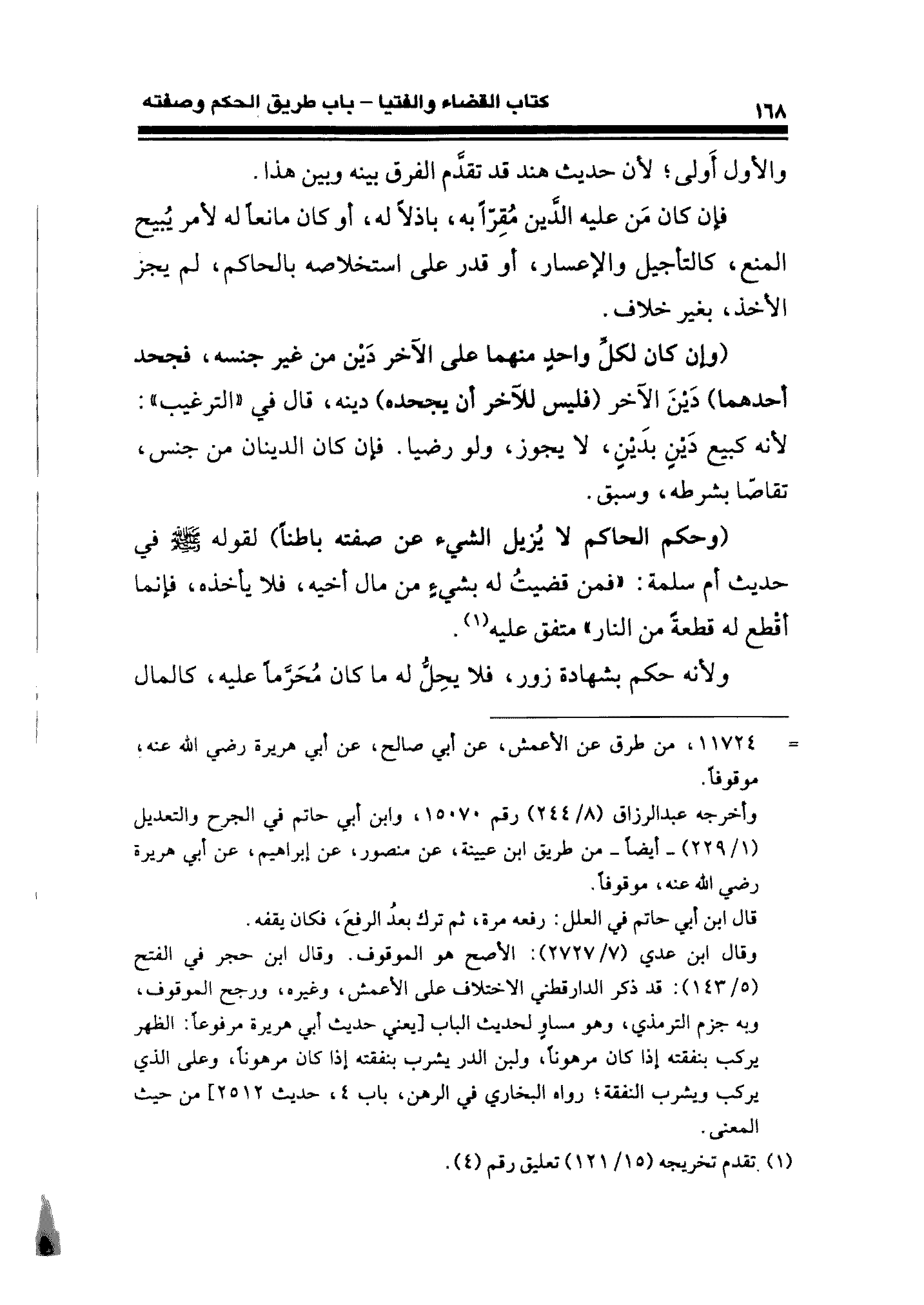 (وحكم الحاكم لا يُزيل الشيء عن صفته باطنًا) لقوله - صلى الله عليه وسلم - في حديث أم سلمة: "فمن قضيتُ له بشيءٍ من مال أخيه، فلا يأخذه، فإنما أتطع له قطعةً من النَّار" متفق عليه (¬١).