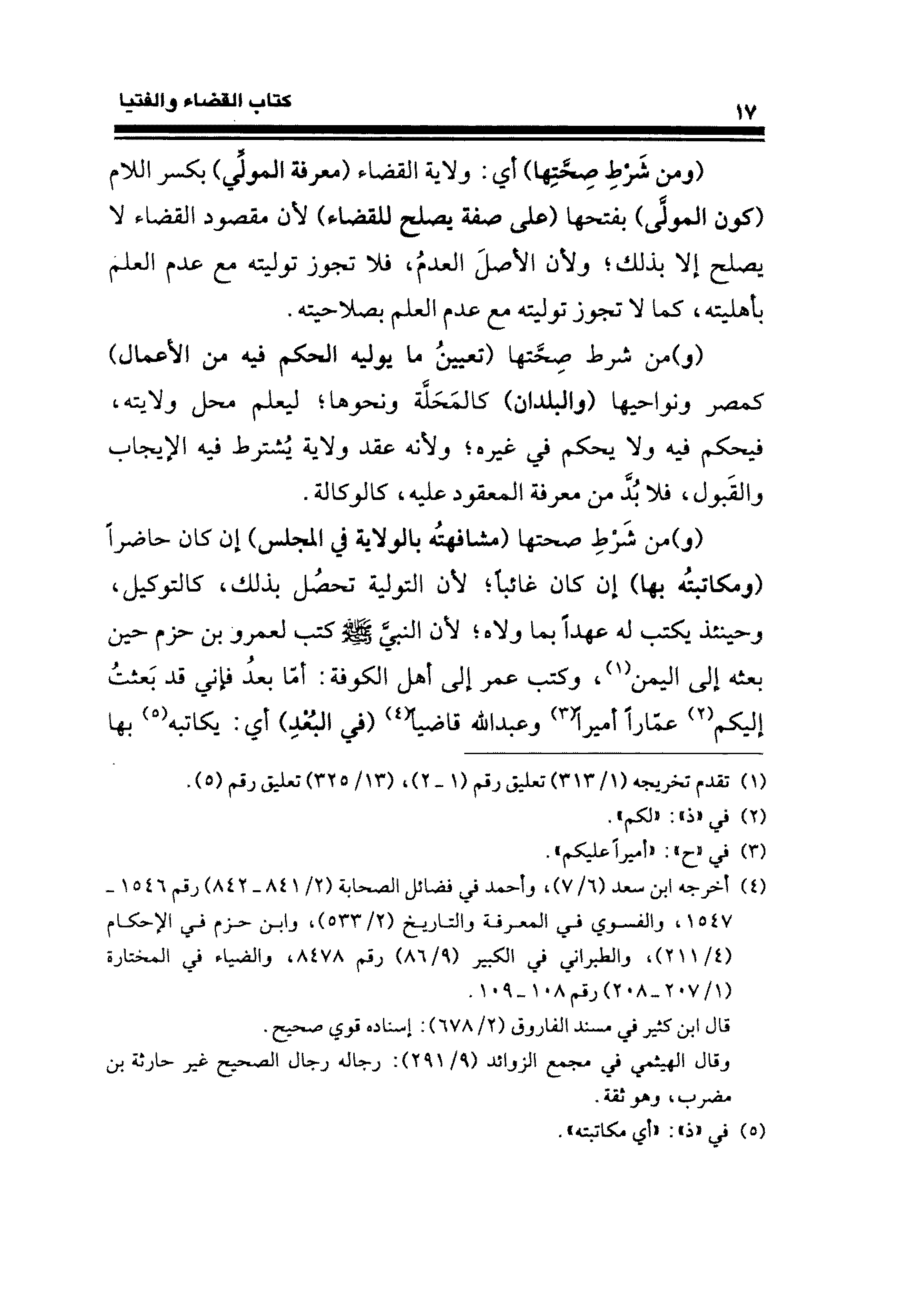 (و) من شَرطِ صحتها (مشافهتُه بالولاية في المجلس) إن كان حاضرًا (ومكاتبته بها) إن كان غائبا؛ لأن التولية تحصُل بذلك، كالتوكيل، وحينئذ يكتب له عهدًا بما ولاه؛ لأن النبى -صلى الله عليه وسلم- كتب لعمرو بن حزم حين بعثه إلى اليمن (¬١)، وكتب عمر إلى أهل الكوفة: أما بعد فإني قد بَعثتُ إليكم (¬٢) عمارًا أميرًا (¬٣) وعبد الله قاضيًا (¬٤) (في البعدِ) أي: يكاتبه (¬٥) بها