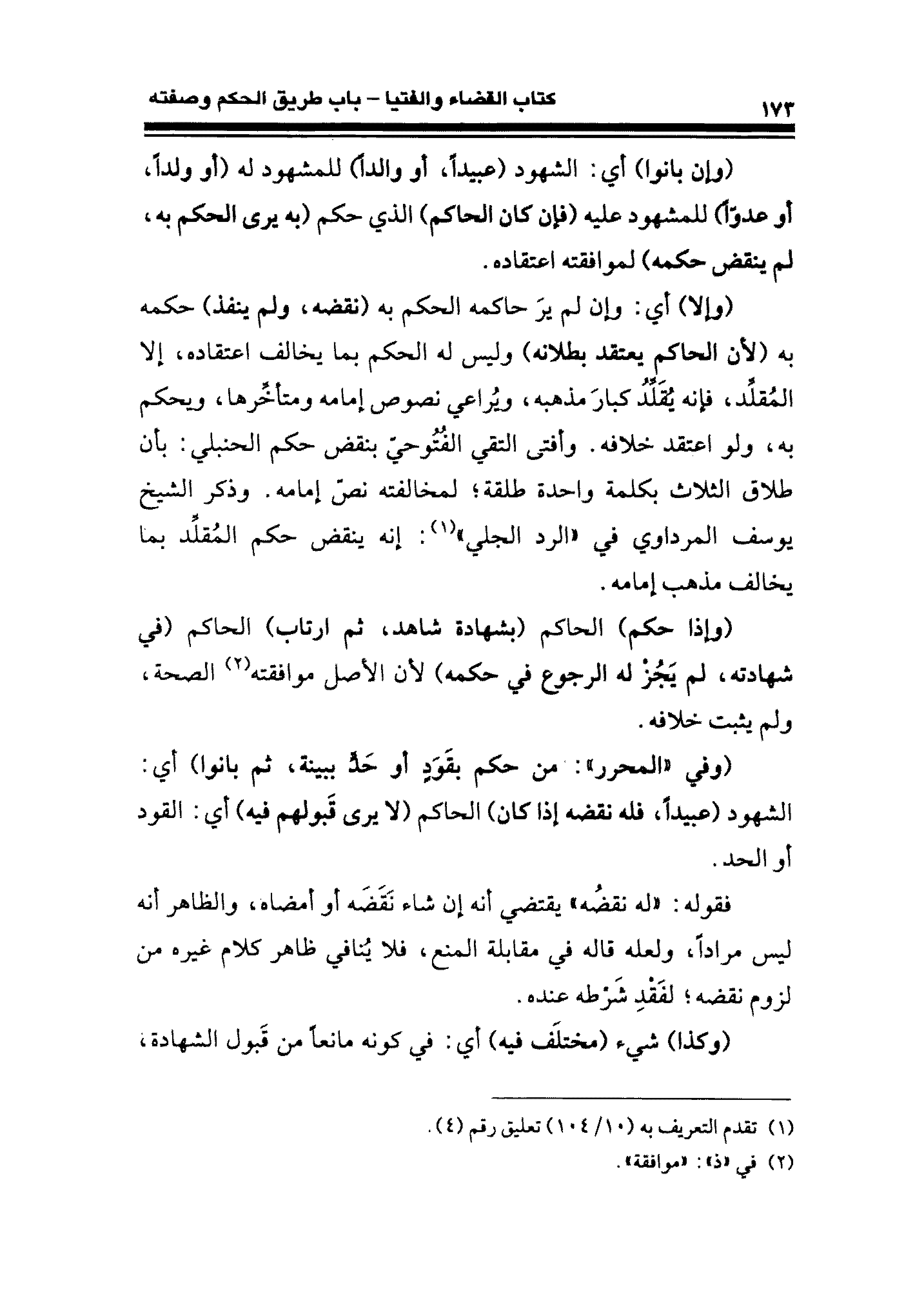 (وإلا) أي: وإن لم يرَ حاكمه الحكم به (نقضه، ولم ينفذ) حكمه به (لأن الحاكم يعتقد بطلانه) وليس له الحكم بما يخالف اعتقاده، إلا المُقلد، فإنه يُقَلَّدُ كبارَ مذهبه، ويُراعي نصوص إمامه ومتأخِّرها؛ ويحكم به، ولو اعتقد خلافه. وأفتى التقي الفُتُوحيّ بنقض حكلم الحنبلى: بأن طلاق الثلاث بكلمة واحدة طلقة؛ لمخالفته نصّ إمامه. وذكر الشيخ يوسف المرداوي في "الرد الجلي" (¬١): إنه ينقض حكم المُقلِّد بما يخالف مذهب إمامه.