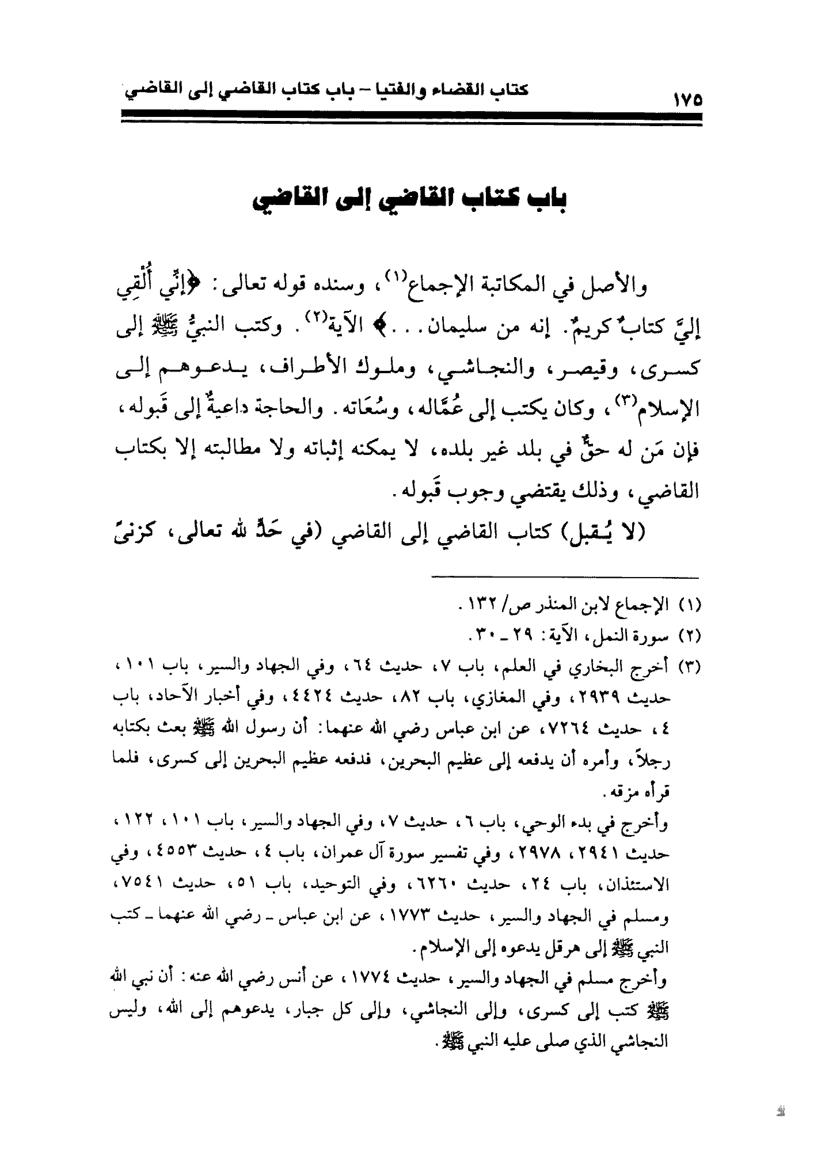 والأصل في المكاتبة الإجماع (¬١)، وسنده قوله تعالى: {إِنِّي أُلْقِيَ إِلَيَّ كِتَابٌ كَرِيمٌ (٢٩) إِنَّهُ مِنْ سُلَيْمَانَ ... } الآية (¬٢). وكتب النبي - صلى الله عليه وسلم - إلى كسرى، وقيصر، والنجاشي، وملوك الأطراف، يدعوهم إلى الإسلام (¬٣)، وكان يكتب إلى عماله، وسُعَاته. والحاجة داعية إلى قَبوله، فإن مَن له حق في بلد غير بلده، لا يمكنه إثباته ولا مطالبته إلا بكتاب القاضي، وذلك يقتضي وجوب قَبوله.