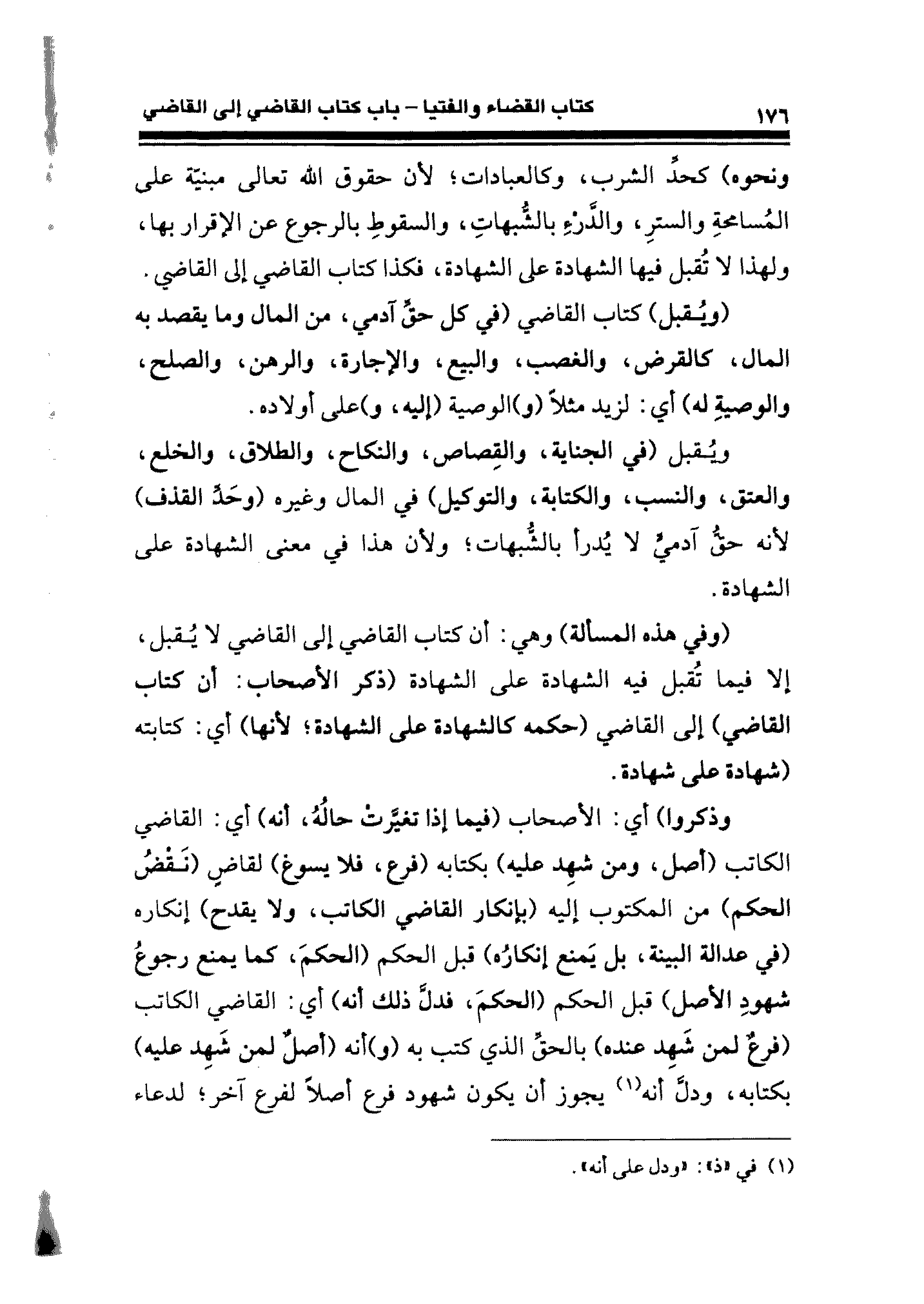 ونحوه) كحدِّ الثوب، وكالعبادات؛ لأن حقوق الله تعالى مبنيّة على المُسامحةِ والسترِ، والدَّرْءِ بالشُّبهاتِ، والسقوطِ بالرجوع عن الإقرار بها، ولهذا لا تُقبل فيها الشهادة على الشهادة، فكذا كتاب القاضي إلى القاضي.