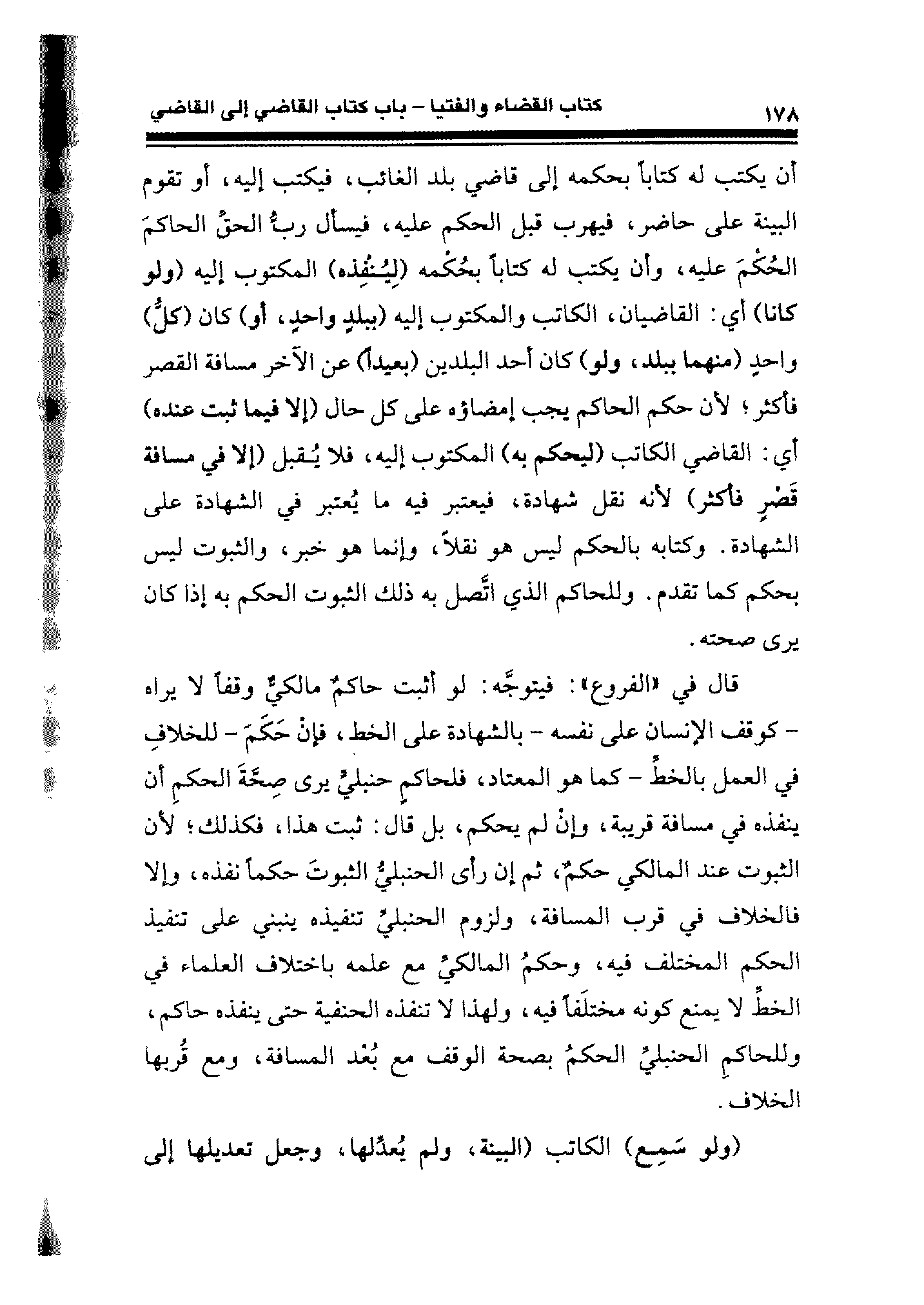 قال في "الفروع": فيتوجَّه: لو أثبت حاكمٌ مالكيٌّ وقفًا لا يراه -كوقف الإنسان على نفسه- بالشهادة على الخط، فإن حَكَمَ -للخلافِ في العمل بالخطِّ- كما هو المعتاد، فلحاكمٍ حنبليٍّ يرى صِحةَ الحكمِ أن ينفذه في مسافة قريبة، وإنْ لم يحكم، بل قال: ثبت هذا، فكذلك؛ لأن الثبوت عند المالكي حكمٌ، ثم إن رأى الحنبليُّ الثبوتَ حكمًا نفذه، وإلا فالخلاف فى قرب المسافة، ولزوم الحنبليِّ تنفيذه ينبني على تنفيذ الحكم المختلف فيه، وحكمُ المالكيِّ مع علمه باختلاف العلماء في الخطِّ لا يمنع كونه مختلَفًا فيه، ولهذا لا تنفذه الحنفية حتى ينفذه حاكم، وللحاكمِ الحنبليِّ الحكمُ بصحة الوقف مع بُعْد المسافة، ومع قُربها الخلاف.