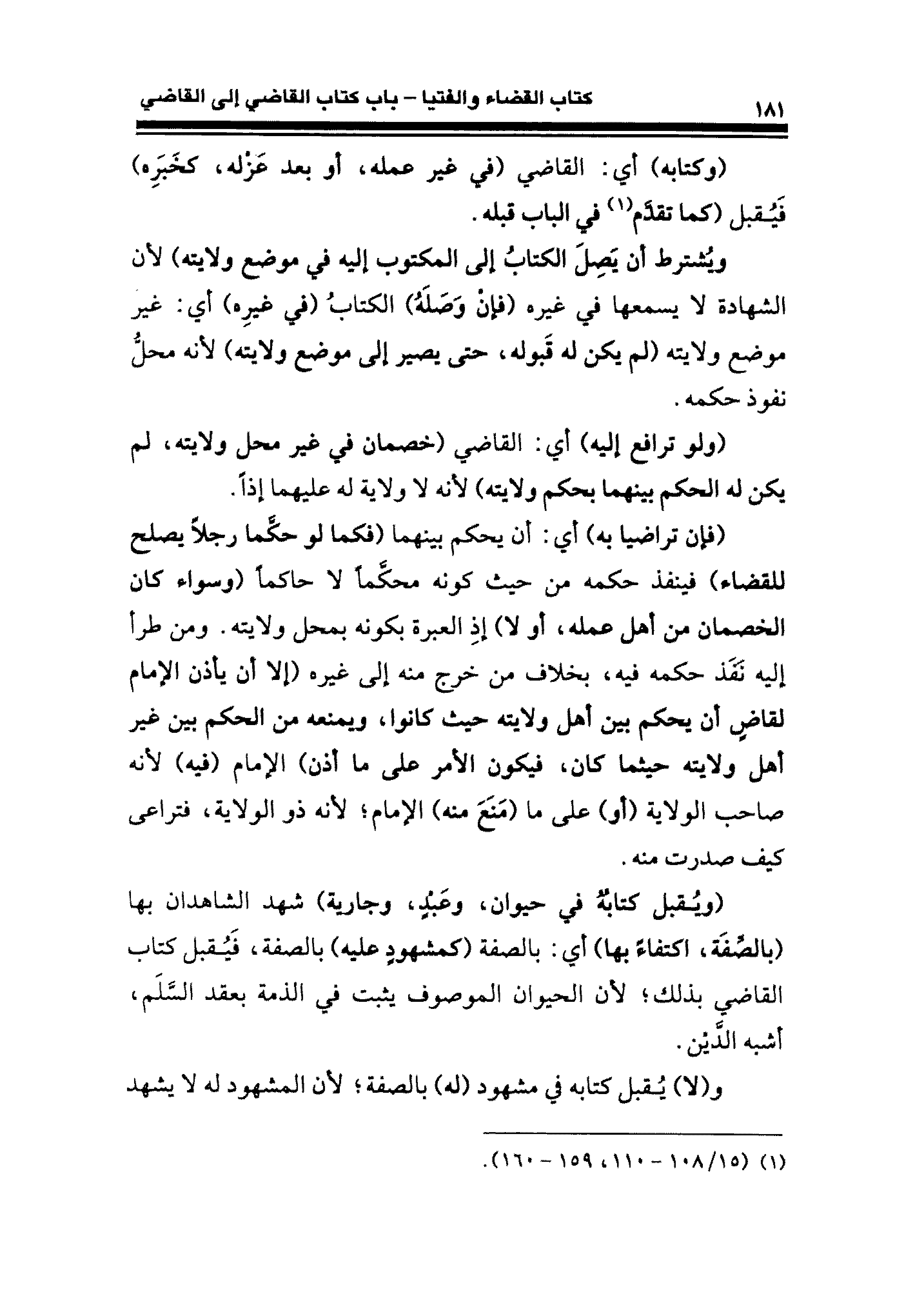 ويشُترط أن يَصِلَ الكتابُ إلى المكتوب إليه في موضع ولايته) لأن الشهادة لا يسمعها في غيره (فإنْ وَصَلَهُ) الكتابُ (في غيرِه) أي: غير موضع ولايته (لم يكن له قَبوله، حتى يصير إلى موضع ولايته) لأنه محلُّ نفوذ حكمه.