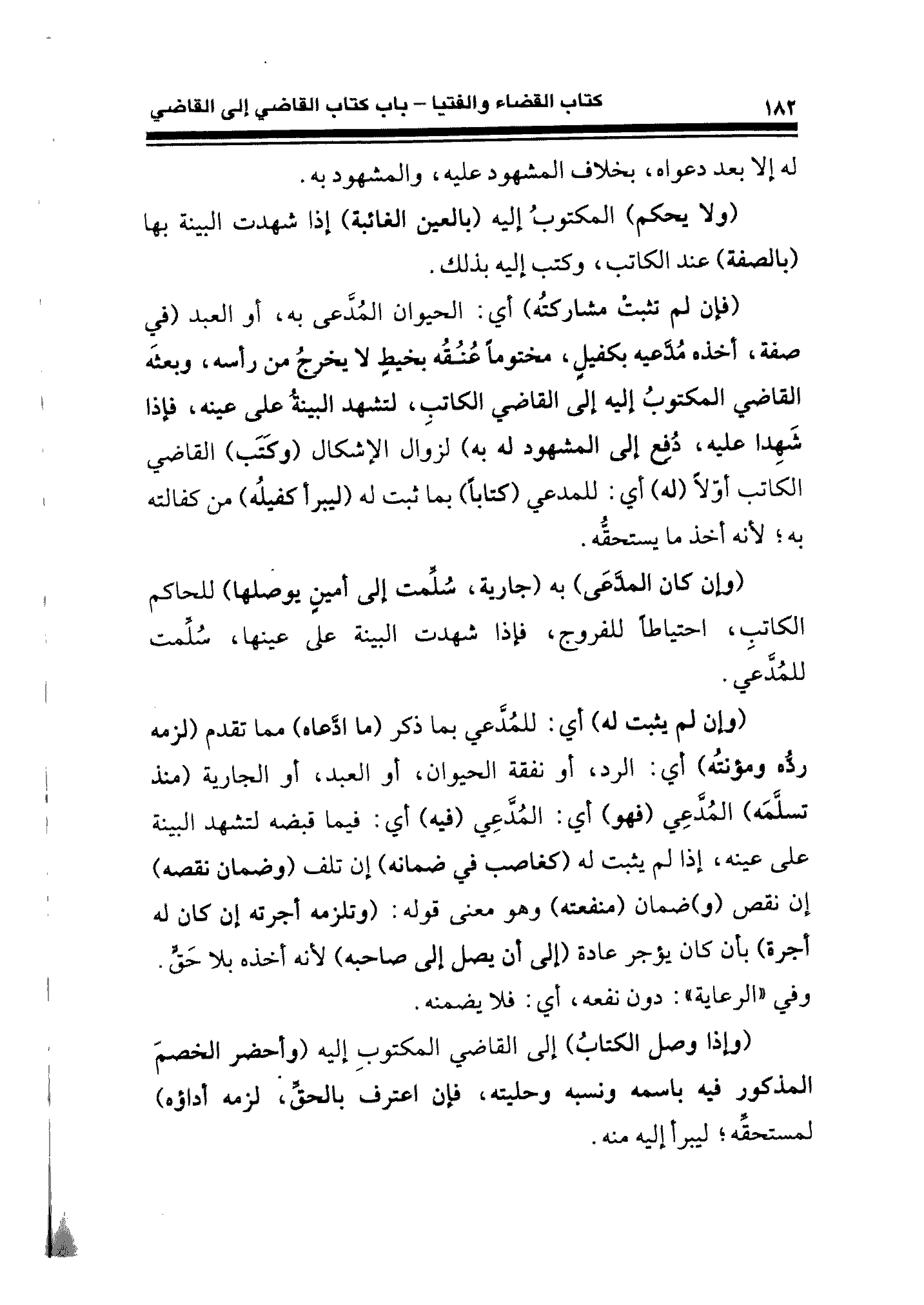 (فإن لم تثبتْ مشاركتُه) أي: الحيوان المُدَّعى به، أو العبد (في صفة، أخذه مُدَّعيه بكفيلٍ، مختومًا عُنُقُه بخيطٍ لا يخرجُ من رأسه، وبعثَه القاضي المكتوبُ إليه إلى القاضي الكاتبِ، لتشهد البينةُ على عينه، فإذا شَهِدا عليه، دُفِع إلى المشهود له به) لزوال الإشكال (وكَتَب) القاضي الكاتب أولًا (له) أي: للمدعي (كتابًا) بما ثبت له (ليبرأ كفيلُه) من كفالته به؛ لأنه أخذ ما يستحقُّه.