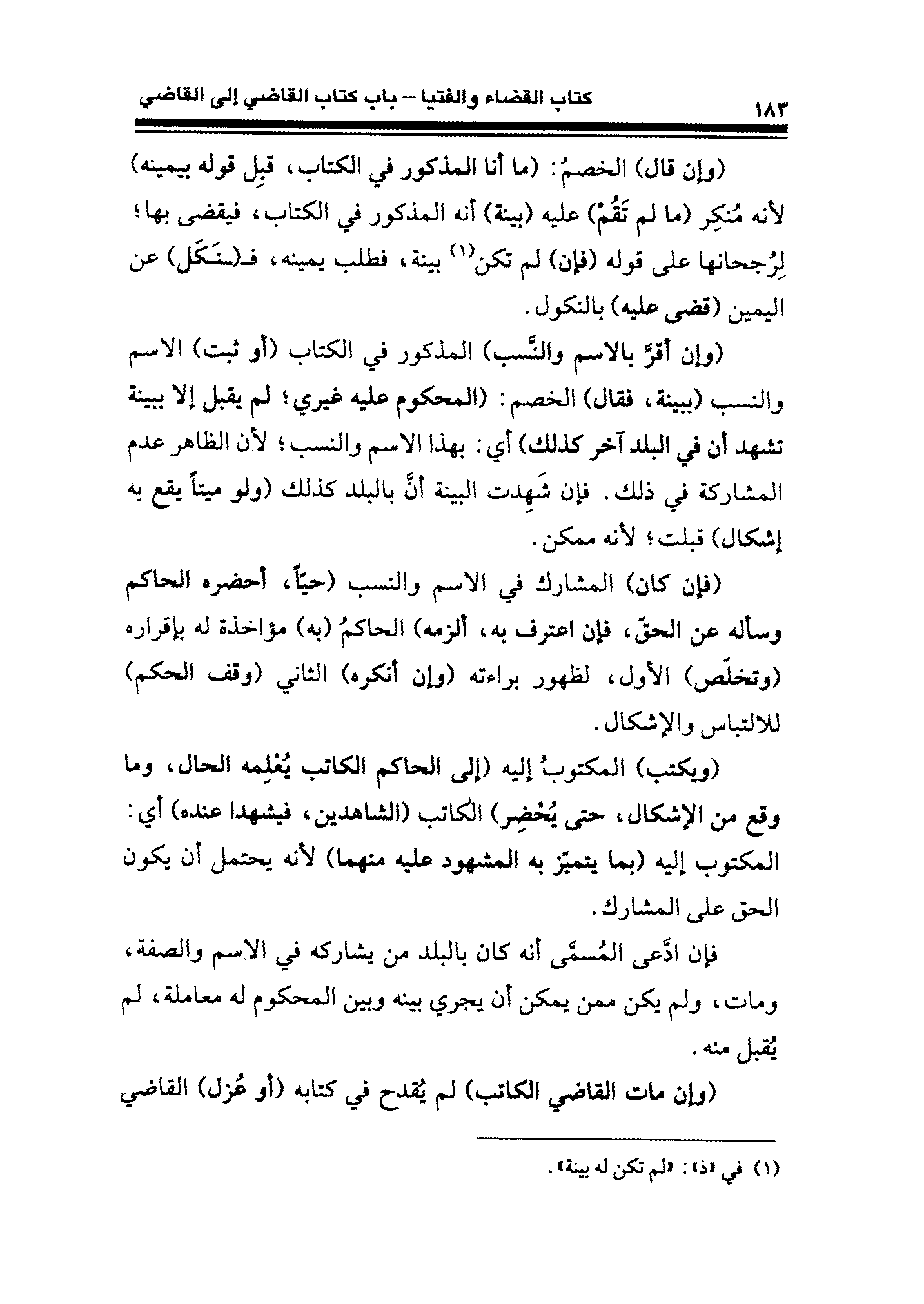 (وإن أقرَّ بالاسم والنَّسب) المذكور في الكتاب (أو ثبت) الاسم والنسب (ببينة، فقال) الخصم: (المحكوم عليه غيري؛ لم يقبل إلا ببينة تشهد أن في البلد آخر كذلك) أي: بهذا الاسم والنسب؛ لأن الظاهر عدم المشاركة في ذلك. فإن شَهِدت البينة أنَّ بالبلد كذلك (ولو ميتًا يقع به إشكال) قبلت؛ لأنه ممكن.