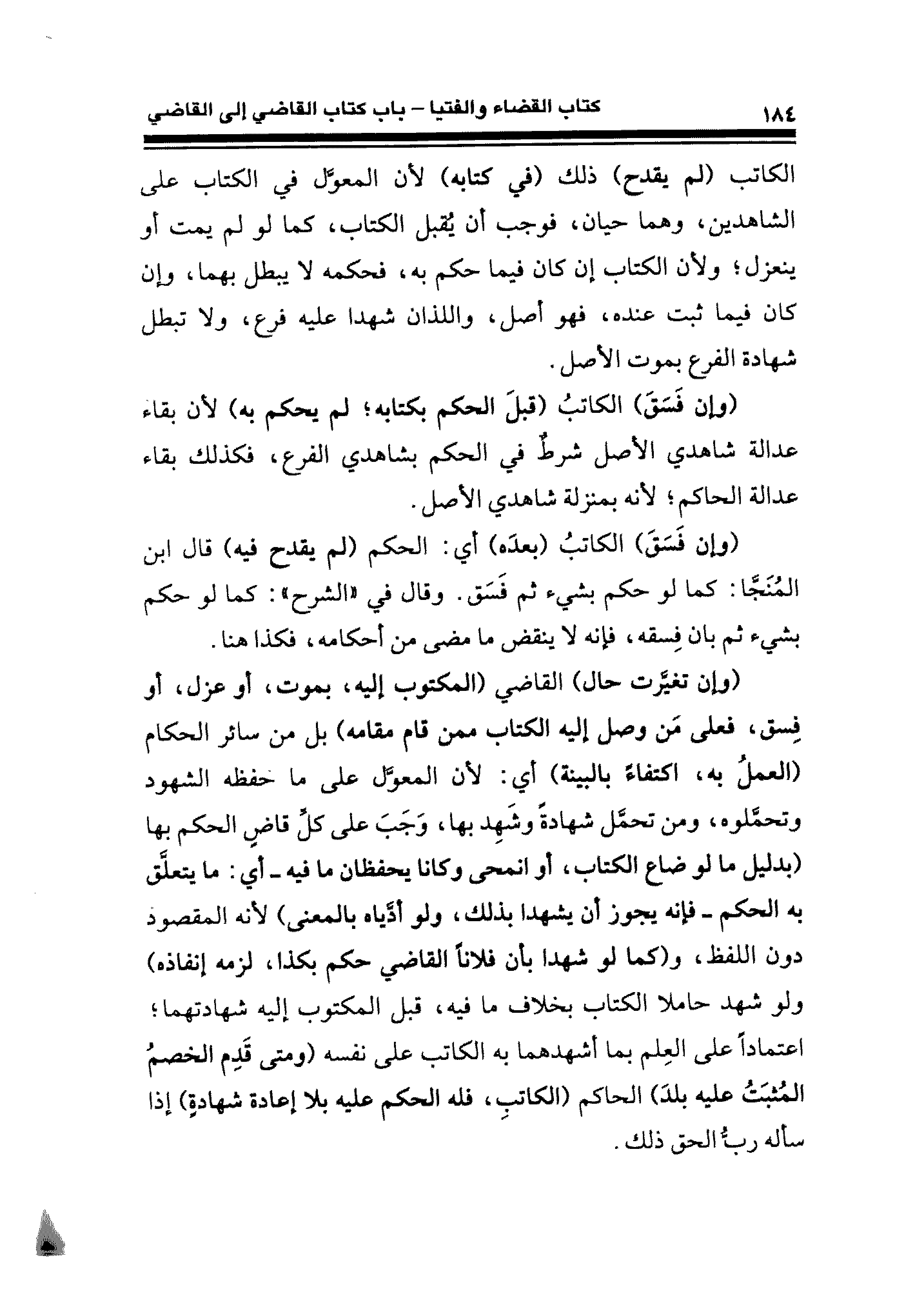 (وإن فَسَقَ) الكاتبُ (قبلَ الحكم بكتابه؛ لم يحكم به) لأن بقاء عدالة شاهدي الأصل شرطٌ في الحكم بشاهدي الفرع، فكذلك بقاء عدالة الحاكم؛ لأنه بمنزلة شاهدي الأصل.