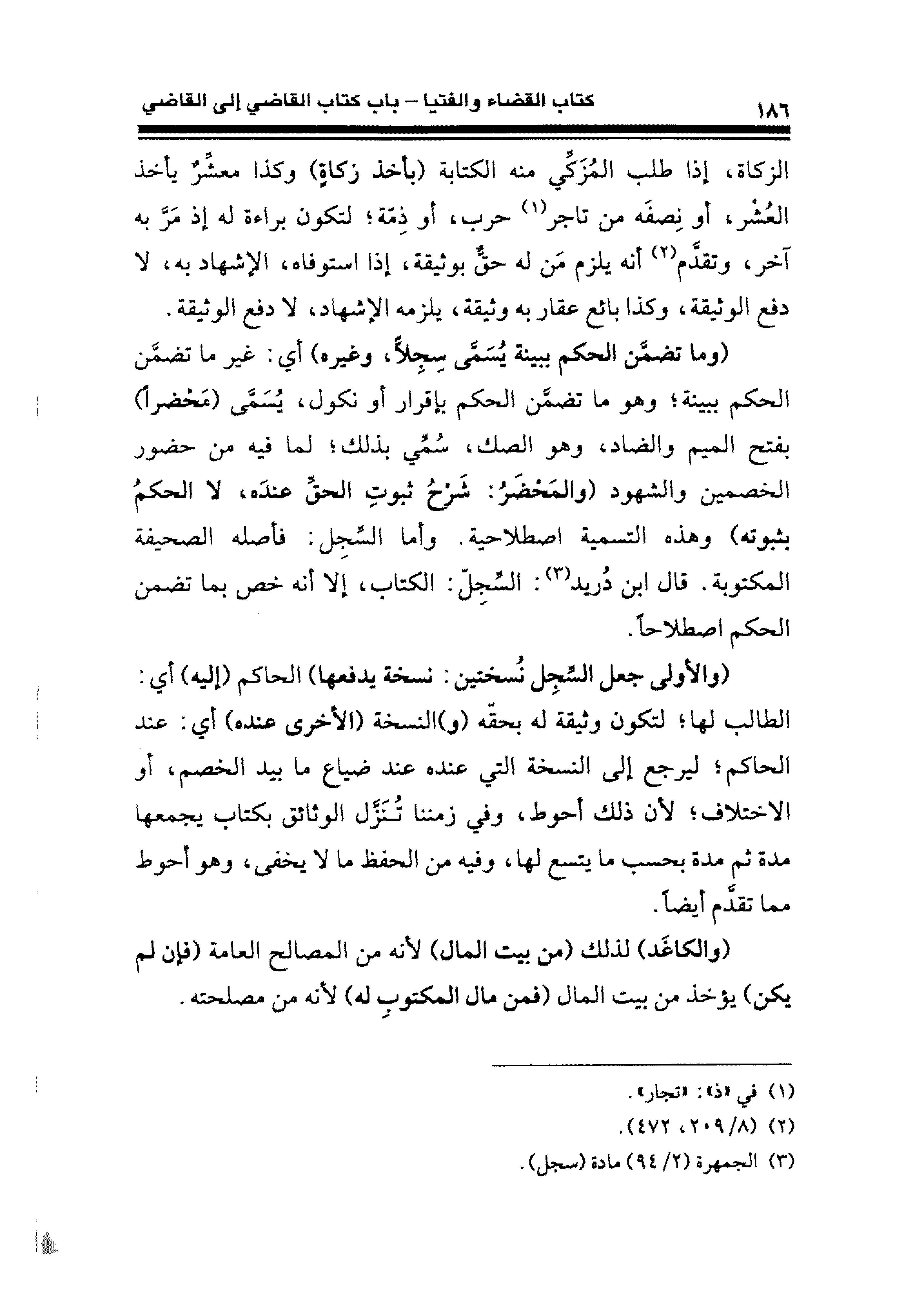 (وما تضمَّن الحكم ببينة يُسَمَّى سِجِلا، وغيره) أي: غير ما تضمَّن الحكم ببينة؛ وهو ما تضمَّن الحكم بإقرار أو نكول، يُسَمَّى (مَحْضرًا) بفتح الميم والضاد، وهو الصك، سُمِّي بذلك؛ لما فيه من حضور الخصمين والشهود (والمَحْضَرُ: شَرْحُ ثبوتِ الحقِّ عندَه، لا الحكمُ بثبوته) وهذه التسمية اصطلاحية. وأما السِّجِل: فأصله الصحيفة المكتوبة. قال ابن دُريد (¬٣): السِّجِلّ: الكتاب، إلا أنه خص بما تضمن الحكم اصطلاحًا.