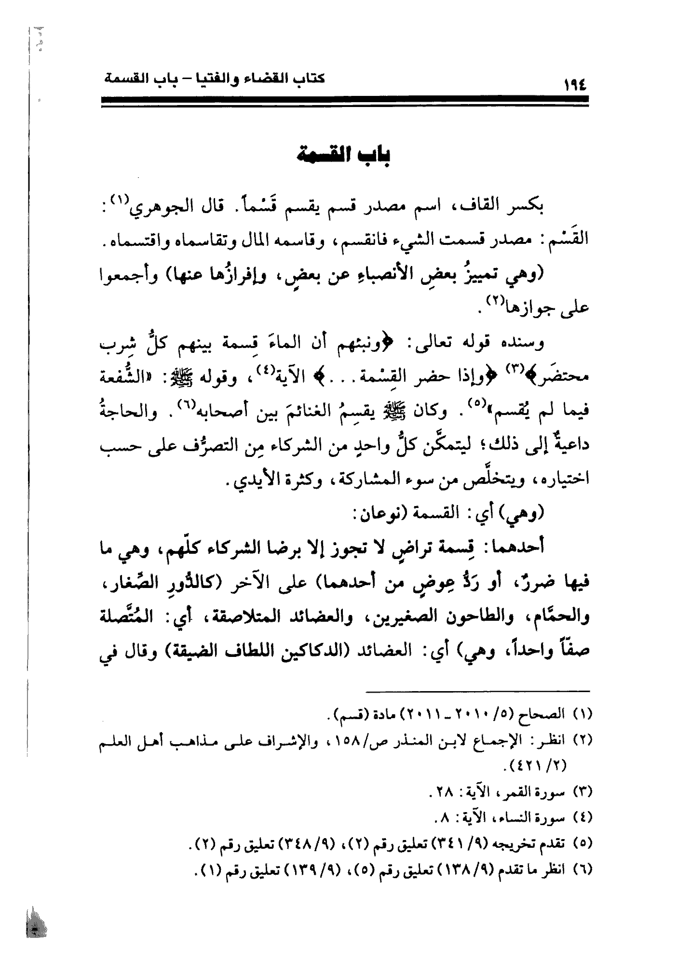 أحدهما: قِسمة تراضٍ لا تجوز إلا برضا الشركاء كلّهم، وهي ما فيها ضررٌ، أو رَدُّ عِوضٍ من أحدهما) على الآخر (كالدُّورِ الصِّغار، والحمَّام، والطاحون الصغيرين، والعضائد المتلاصقة، أي: المُتَّصلة صفًا واحدًا، وهي) أي: العضائد (الدكاكين اللطاف الضيقة) وقال فى