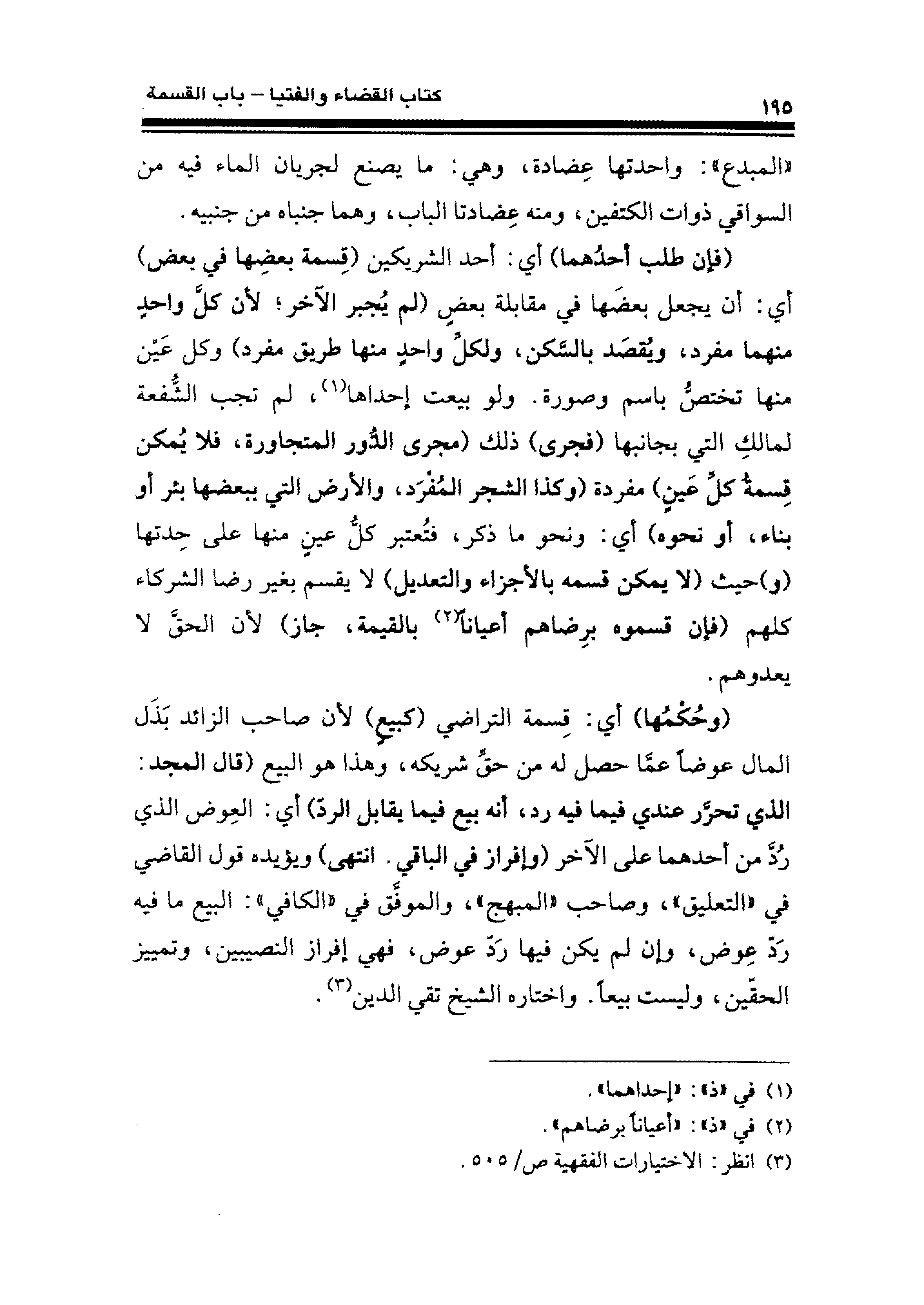 (وحُكْمُها) أي: قِسمة التراضي (كبيعٍ) لأن صاحب الزائد بَذَل المال عوضًا عمَّا حصل له من حقِّ شريكه، وهذا هو البيع (قال المجد: الذي تحرَّر عندي فيما فيه رد، أنه بيع فيما يقابل الردّ) أي: العِوض الذي رُدَّ من أحدهما على الآخر (وإفراز في الباقي. انتهى) ويؤيده قول القاضي في "التعليق"، وصاحب "المبهج"، والموفَّق في "الكافي": البيع ما فيه رَدّ عِوض، وإن لم يكن فيها رَدّ عوض، فهي إفراز النصيبين، وتمييز الحقّين، وليست بيعًا. واختاره الشيخ تقي الدين (¬٣).