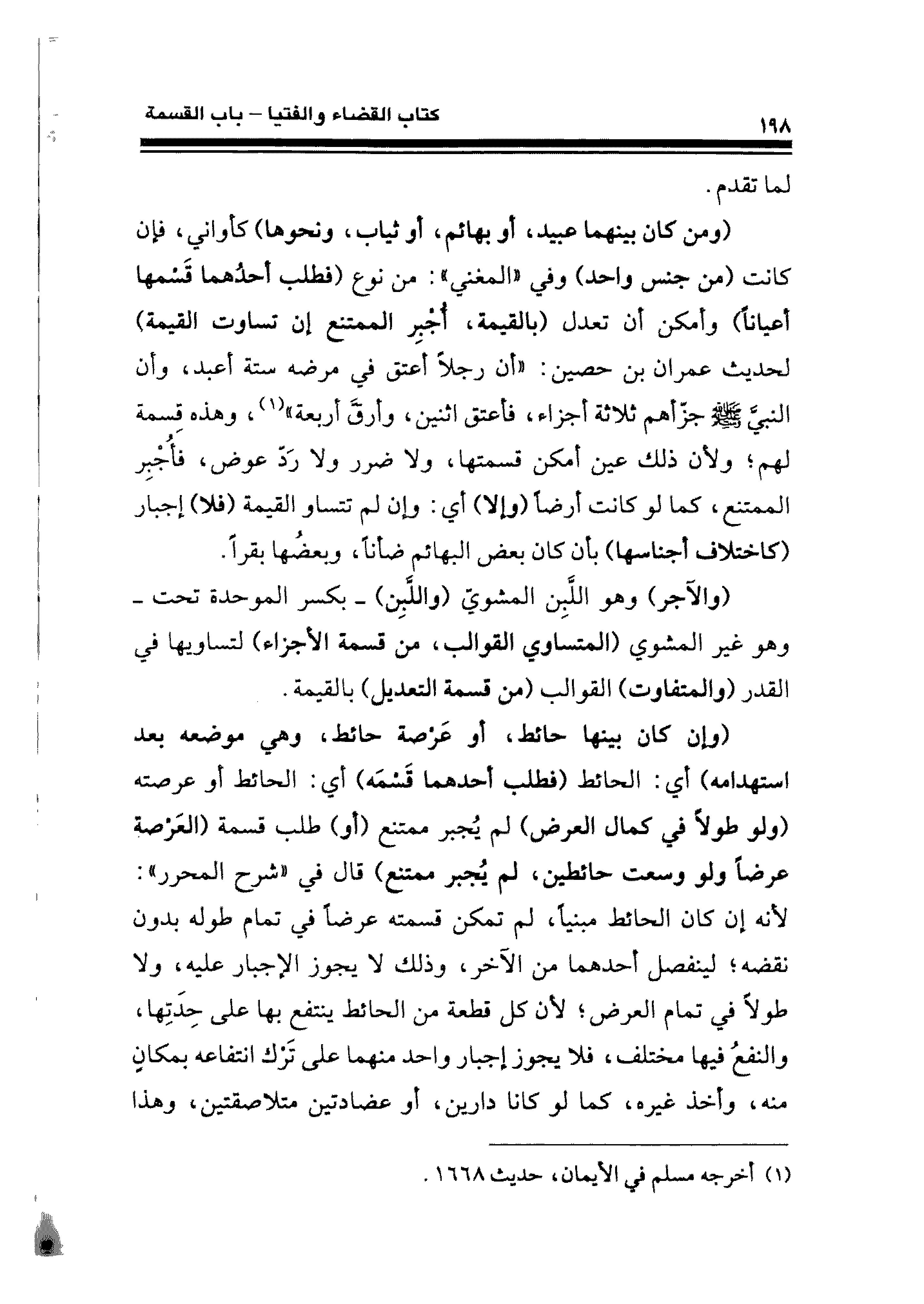 (ومن كان بينهما عبيد، أو بهائم، أو ثياب، ونحوها) كأواني، فإن كانت (من جنس واحد) وفي "المغني": من نوع (فطلب أحدُهما قَسْمها أعيانًا) وأمكن أن تعدل (بالقيمة، أُجْبِر الممتنع إن تساوت القيمة) حديث عمران بن حصين: "أن رجلًا أعتق في مرضه ستة أعبد، وأن النبي - صلى الله عليه وسلم - جزّأهم ثلاثة أجزاء، فأعتق اثنين، وأرقّ أربعة" (¬١)، وهذه قِسمة لهم؛ ولأن ذلك عين أمكن قسمتها، ولا ضرر ولا رَدّ عوض، فأُجْبِر الممتنع، كما لو كانت أرضًا (وإلا) أي: وإن لم تتساو القيمة (فلا) إجبار (كاختلاف أجناسها) بأن كان بعض البهائم ضأنًا، وبعضُها بقرًا.