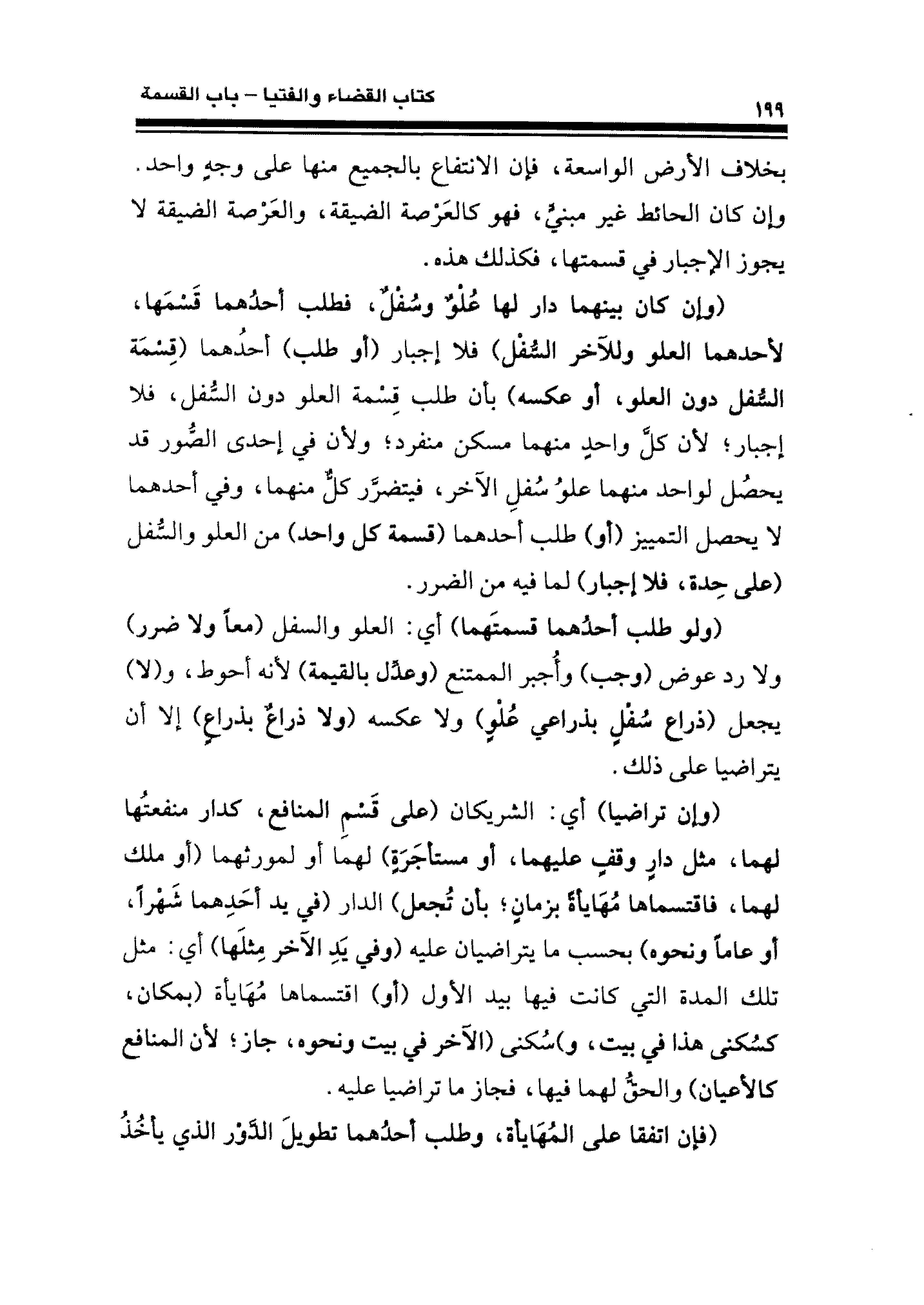 (وإن كان بينهما دار لها عُلْوٌ وسُفْلٌ، فطلب أحدُهما قَسْمَها، لأحدهما العلو وللآخر السُّفْل) فلا إجبار (أو طلب) أحدُهما (قِسْمَة السُّفل دون العلو، أو عكسه) بأن طلب قِسْمة العلو دون السُّفل، فلا إجبار؛ لأن كلَّ واحدٍ منهما مسكن منفرد؛ ولأن في إحدى الصُّور قد يحصُل لواحد منهما علوُ سُفلِ الآخر، فيتضرَّر كل منهما، وفي أحدهما لا يحصل التمييز (أو) طلب أحدهما (قسمة كل واحد) من العلو والسُّفل (على حِدة، فلا إجبار) لما فيه من الضرر.