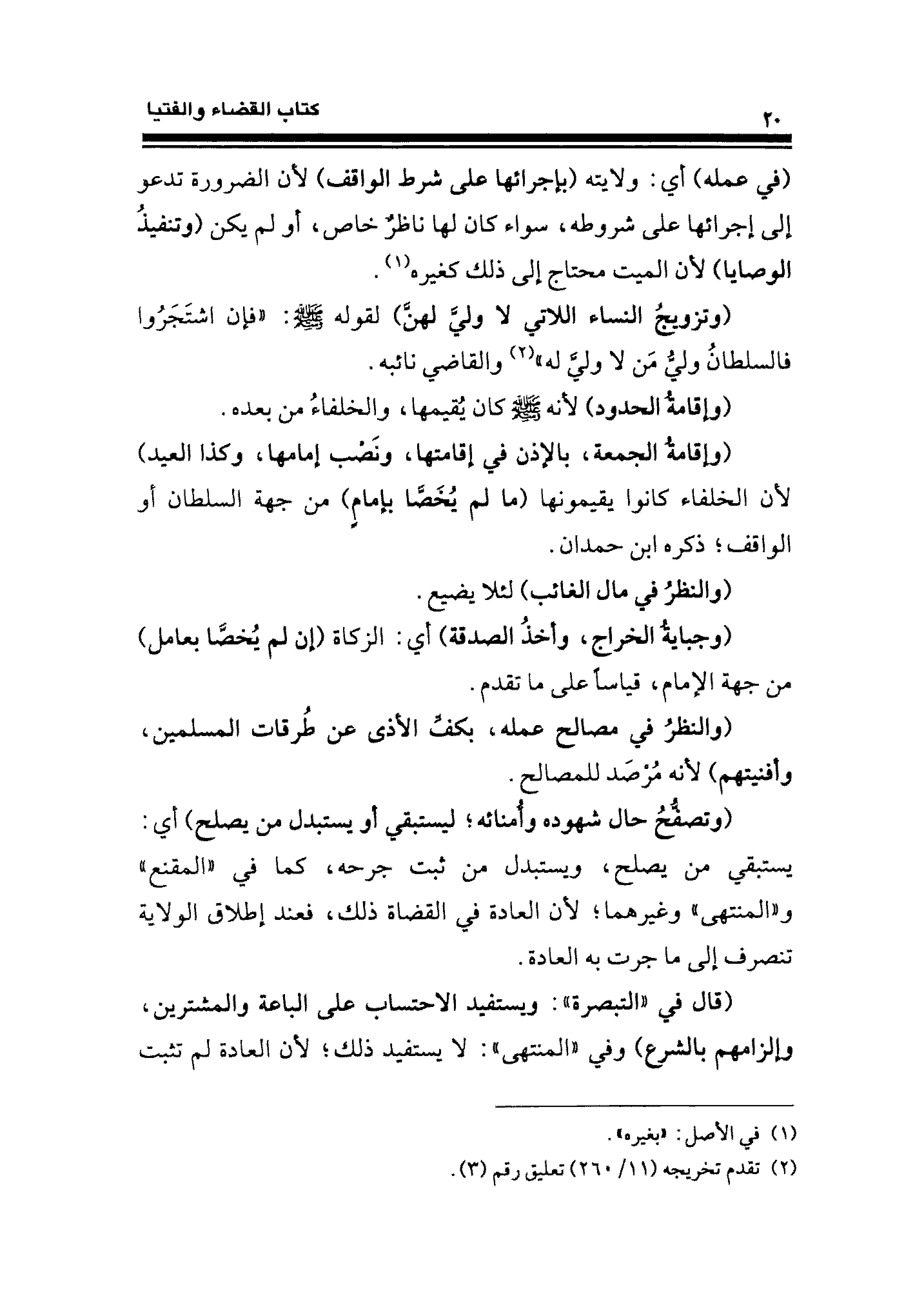 (في عمله) أي: ولايته (بإجرائها على شرط الواقف) لأن الضرورة تدعو إلى إجرائها على شروطه، سواء كان لها ناظرٌ خاص، أو لم يكن (وتنفيذُ الوصايا) لأن الميت محتاج إلى ذلك كغيره (¬١).