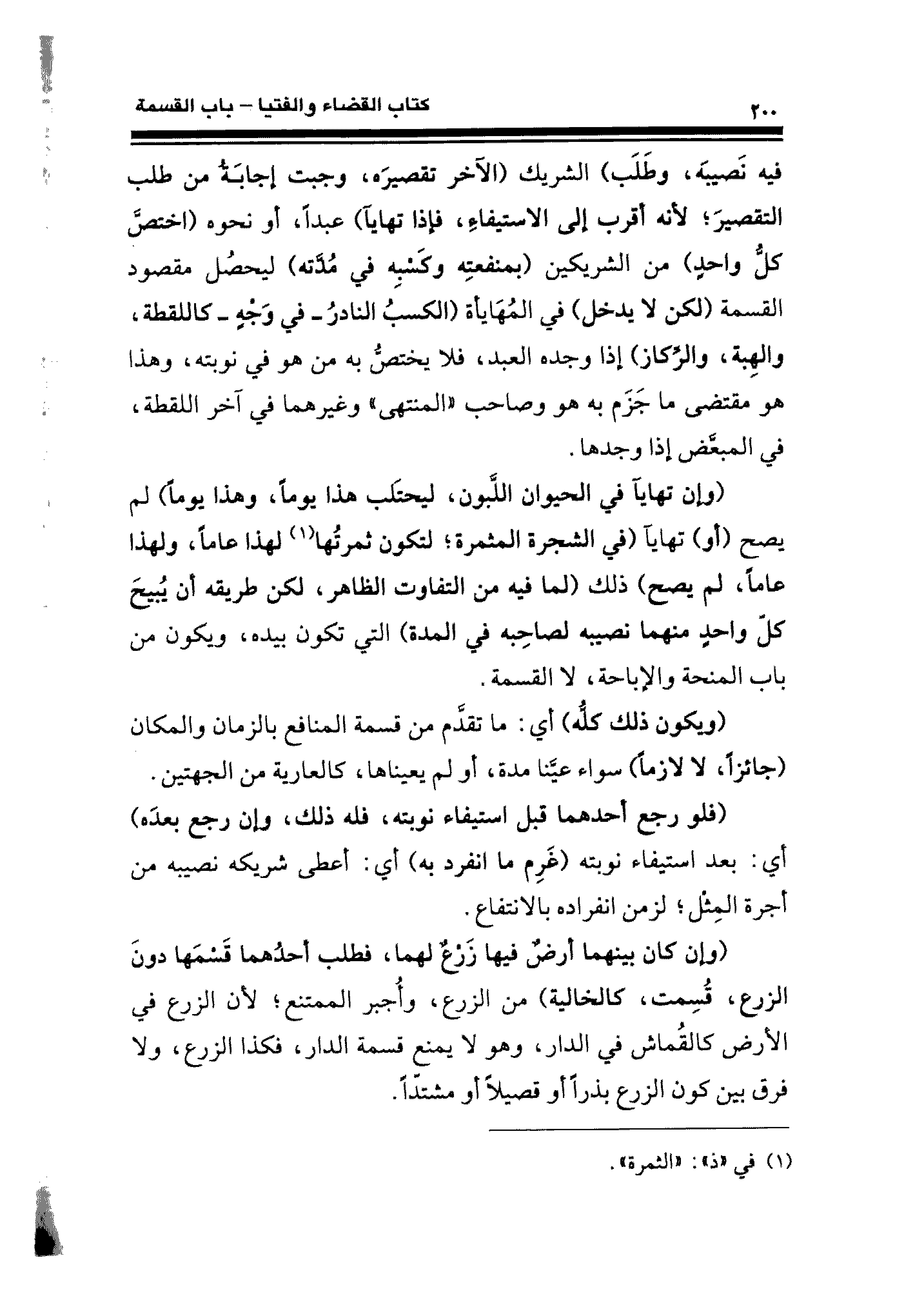 فيه نَصيبَه، وطَلَب) الشريك (الآخر تقصيرَه، وجبت إجابَةُ من طلب التقصيرَ؛ لأنه أقرب إلى الاستيفاء، فإذا تهايآ) عبدًا، أو نحوه (اختصَّ كلُّ واحدٍ) من الشريكين (بمنفعتِه وكَسْبِه في مُدَّته) ليحصُل مقصود القسمة (لكن لا يدخل) في المُهَايأة (الكسبُ النادرُ -في وَجْهٍ- كاللقطة، والهِبة، والرِّكاز) إذا وجده العبد، فلا يختصُّ به من هو في نوبته، وهذا هو مقتضى ما جَزَم به هو وصاحب (المنتهى، وغيرهما في آخر اللقطة، في المبعَّض إذا وجدها.