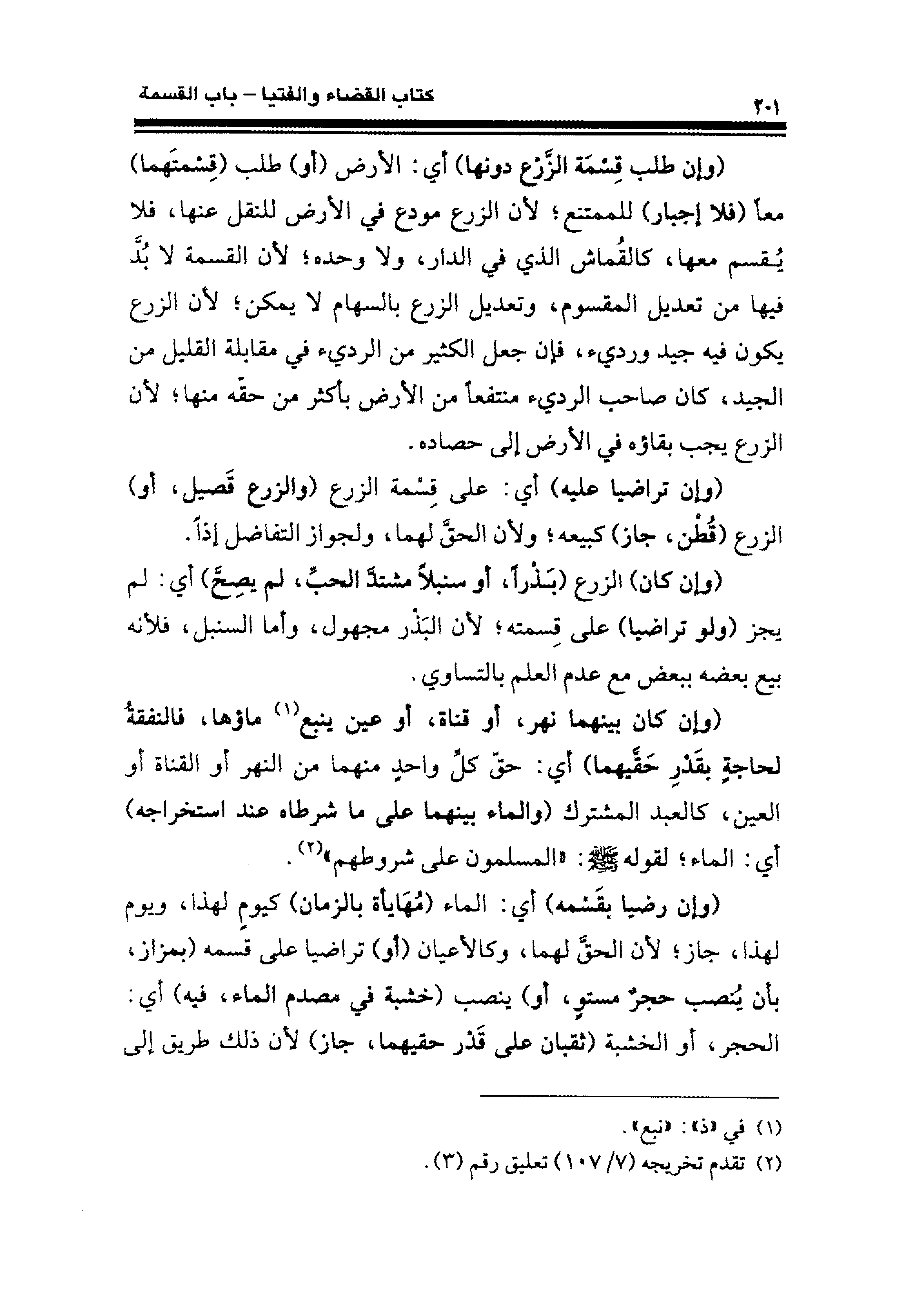 (وإن طلب قِسْمَة الزَّرْع دونها) أي: الأرض (أو) طلب (قِسْمتَهما) معا (فلا إجبار) للمتنع؛ لأن الزرع مودع في الأرض للنقل عنها، فلا يقسم معها، كالقُماش الذي في الدار، ولا وحده؛ لأن القسمة لا بُدَّ فيها من تعديل المقسوم، وتعديل الزرع بالسهام لا يمكن؛ لأن الزرع يكون فيه جيد ورديء، فإن جعل الكثير من الرديء في مقابلة القليل من الجيد، كان صاحب الرديء منتفعًا من الأرض بأكثر من حقّه منها؛ لأن الزرع يجب بقاؤه في الأرض إلى حصاده.