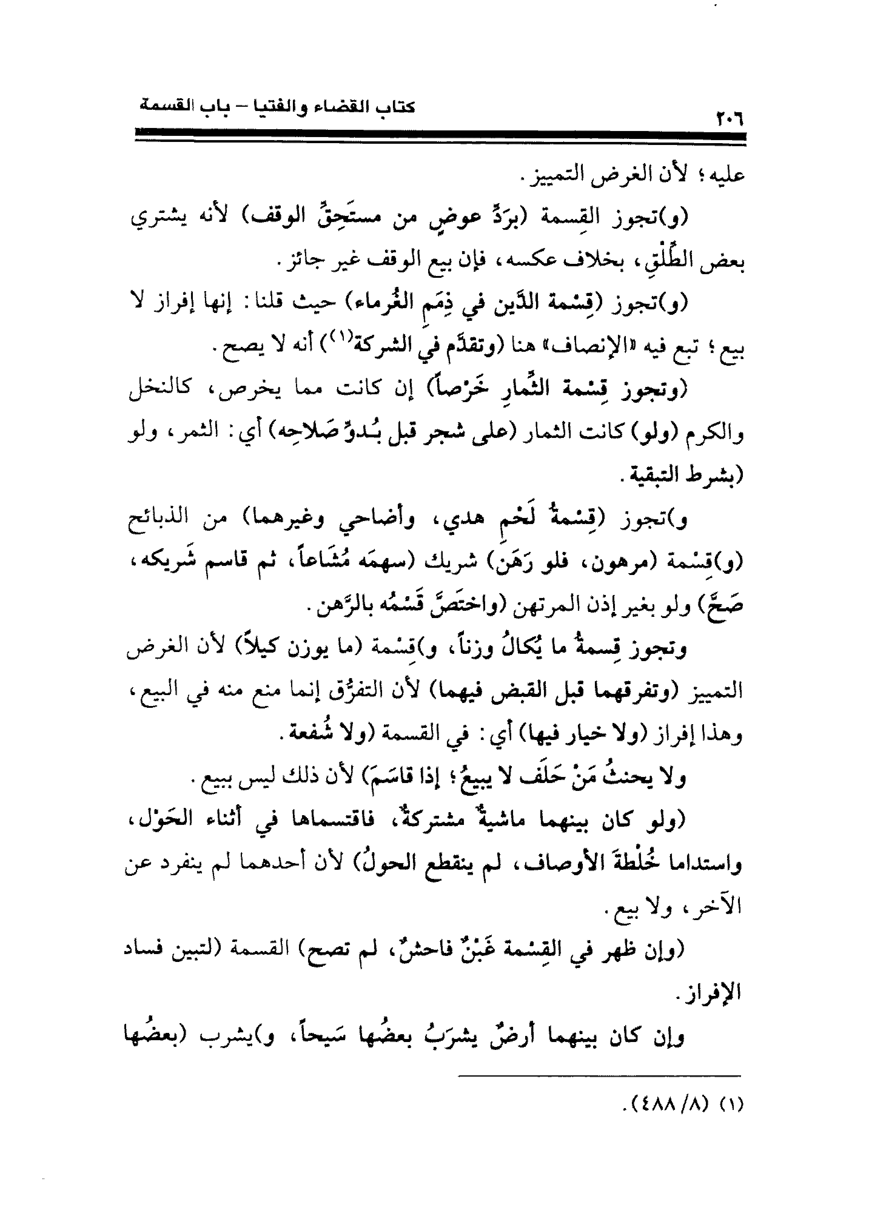(و) تجوز القِسمة (برَدِّ عوضٍ من مستَحِقِّ الوقف) لأنه يشتري بعض الطِّلْقِ، بخلاف عكسه، فإن بيع الوقف غير جائز.