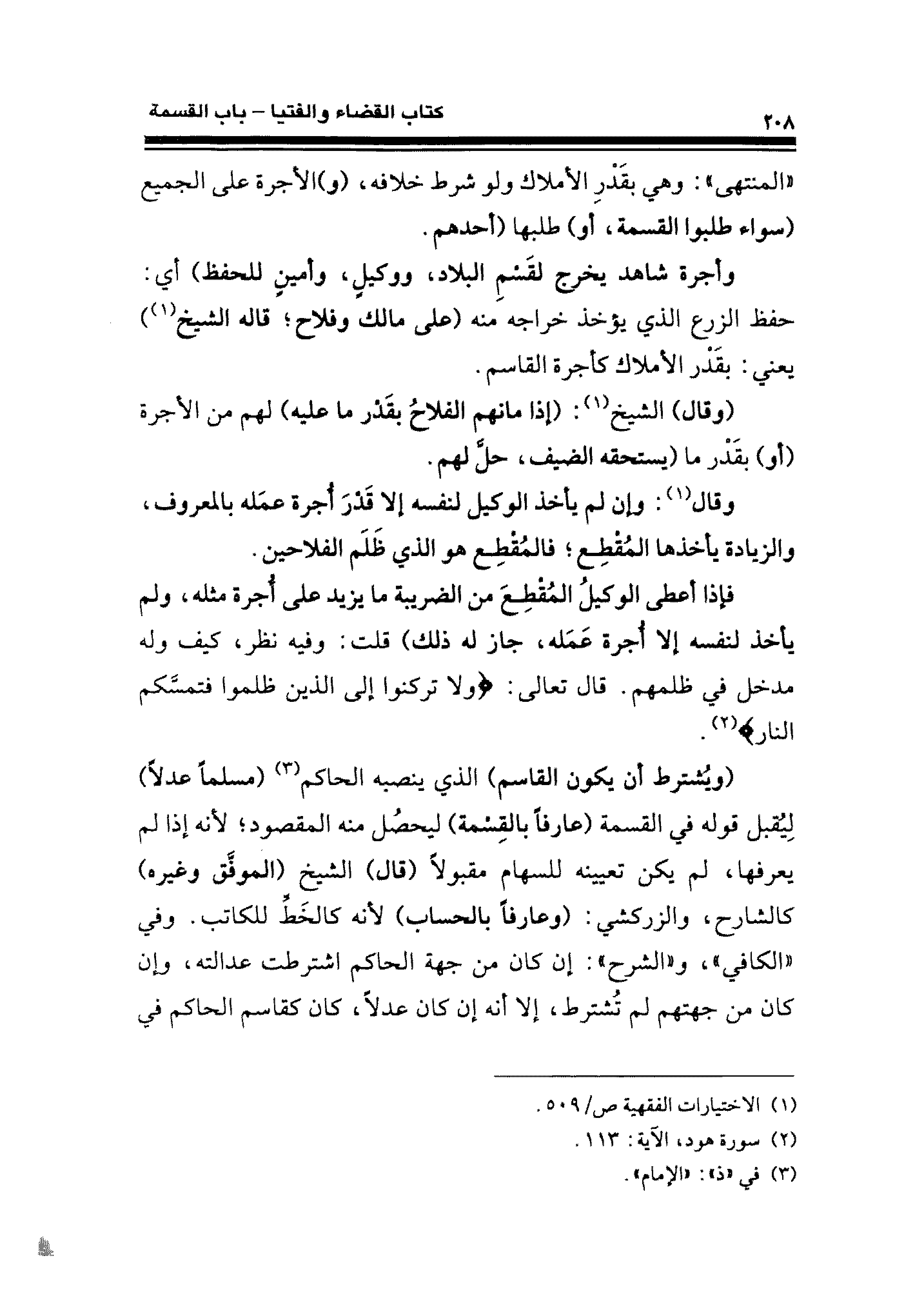 (ويُشترط أن يكون القاسم) الذي ينصبه الحاكم (¬٣) (مسلمًا عدلًا) لِيُقبل قوله فِي القسمة (عارفًا بالقِسْمة) ليحصُل منه المقصود؛ لأنه إذا لم يعرفها، لم يكن تعيينه للسهام مقبولًا (قال) الشيخ (الموفَّق وغيره) كالشارح، والزركشي: (وعارفًا بالحساب) لأنه كالخَطِّ للكاتب. وفي "الكافي"، و "الشرح": إن كان من جهة الحاكم اشترطت عدالته، وإن كان من جهتهم لم تُشترط، إلَّا أنَّه إن كان عدلًا، كان كقاسم الحاكم فِي