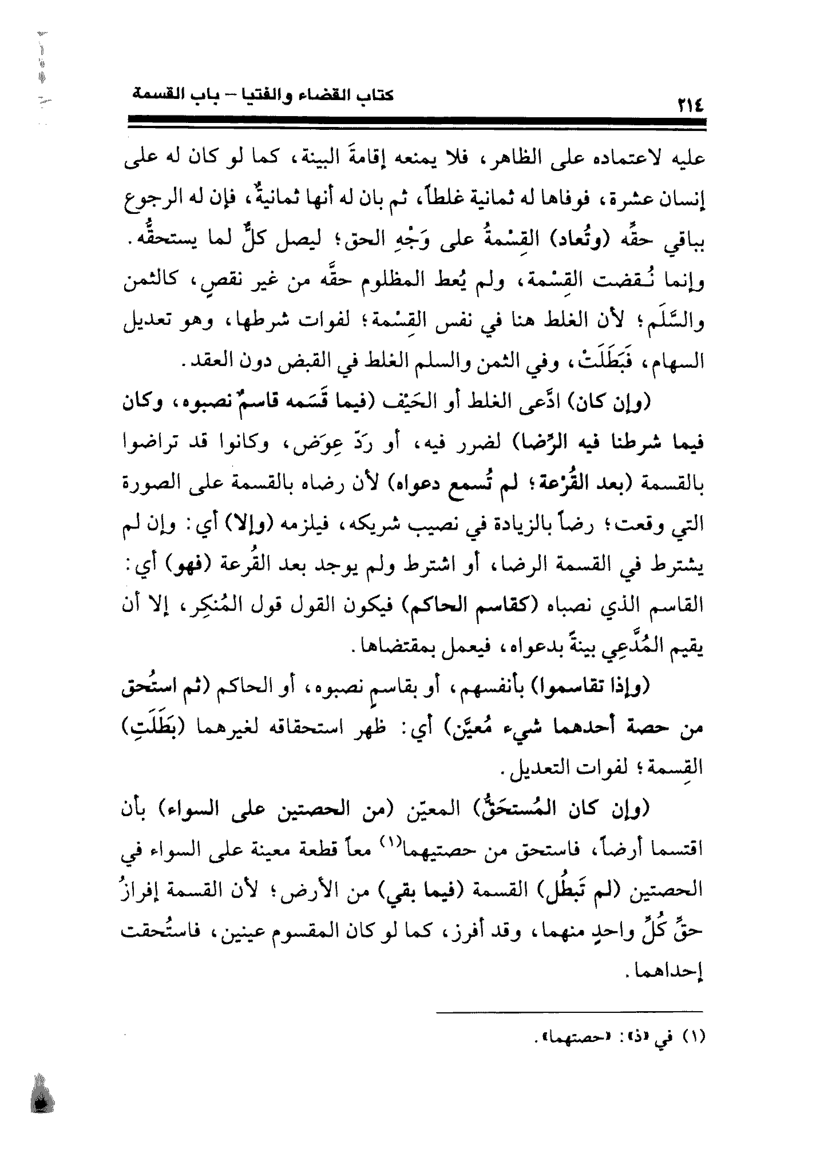 عليه لاعتماده على الظاهر، فلا يمنعه إقامةَ البينة، كما لو كان له على إنسان عشرة، فوفاها له ثمانية غلطًا، ثم بان له أنها ثمانيةٌ، فإن له الرجوع بباقي حقِّه (وتُعاد) القِسْمةُ على وَجْهِ الحق؛ ليصل كلُّ لما يستحقُّه. وإنما نُقضت القِسمة، ولم يُعط المظلوم حقِّه من غير نقص، كالثمن والسَّلَم؛ لأن الغلط هنا في نفس القِسمة؛ لفوات شرطها، وهو تعديل السهام، فَبَطَلَت، وفي الثمن والسلم الغلط في القبض دون العقد.