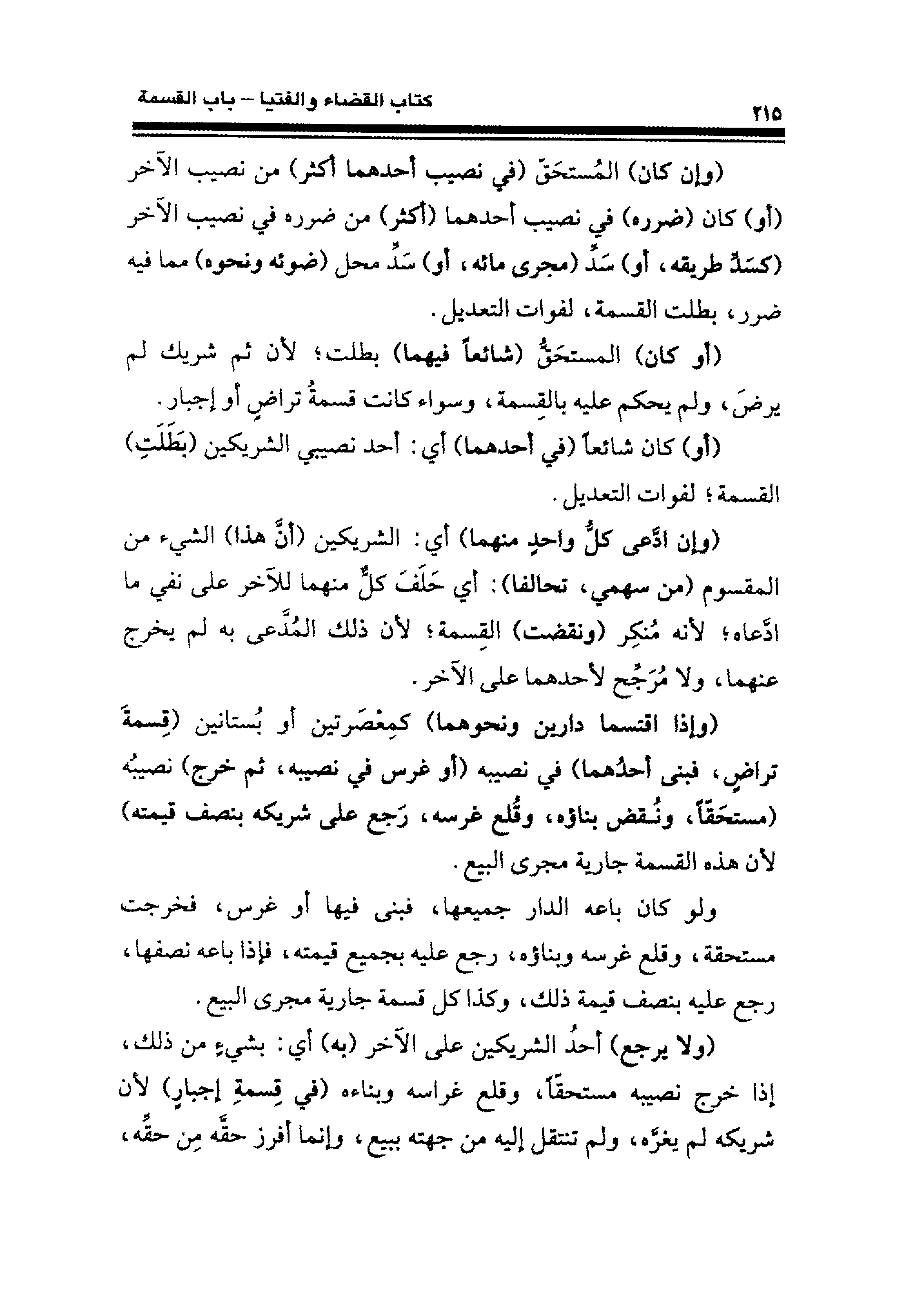 (أو كان) المستحَقُّ (شائعًا نيهما) بطلت؛ لأن ثم شريك لم يرضَ، ولم يحكم عليه بالقِسمة، وسواء كانت قسمةُ تراضٍ أو إجبار.