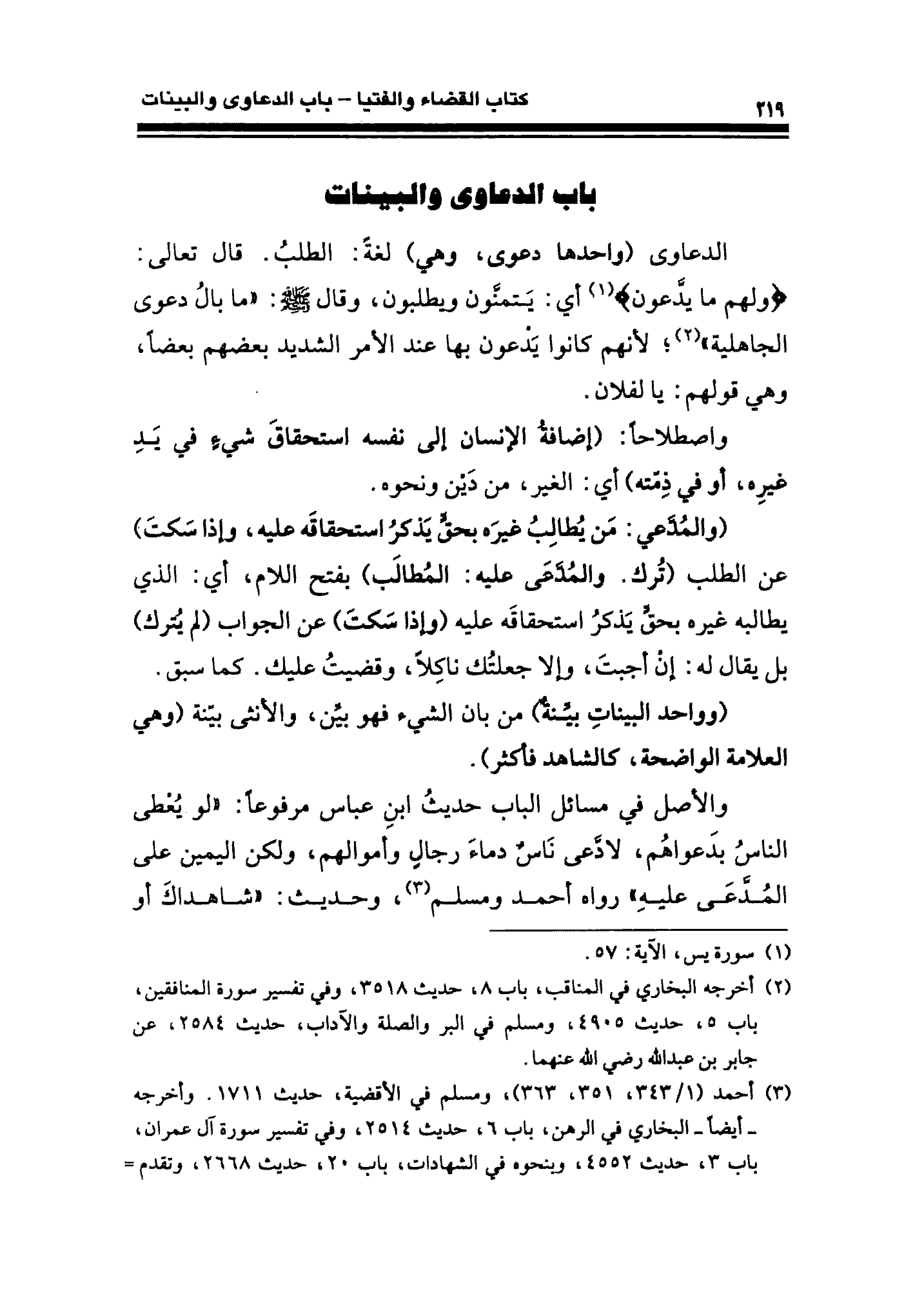 الدعاوى (واحدها دعوى، وهي) لغةً: الطلبُ. قال تعالى: {ولهم ما يدَّعون} (¬١) أي: يَتمنَّون ويطلبون، وقال - صلى الله عليه وسلم -: "ما بالُ دعوى الجاهلية" (¬٢)؛ لأنهم كانوا يَدْعون بها عند الأمر الشديد بعضهم بعضًا، وهي قولهم: يا لفلان.