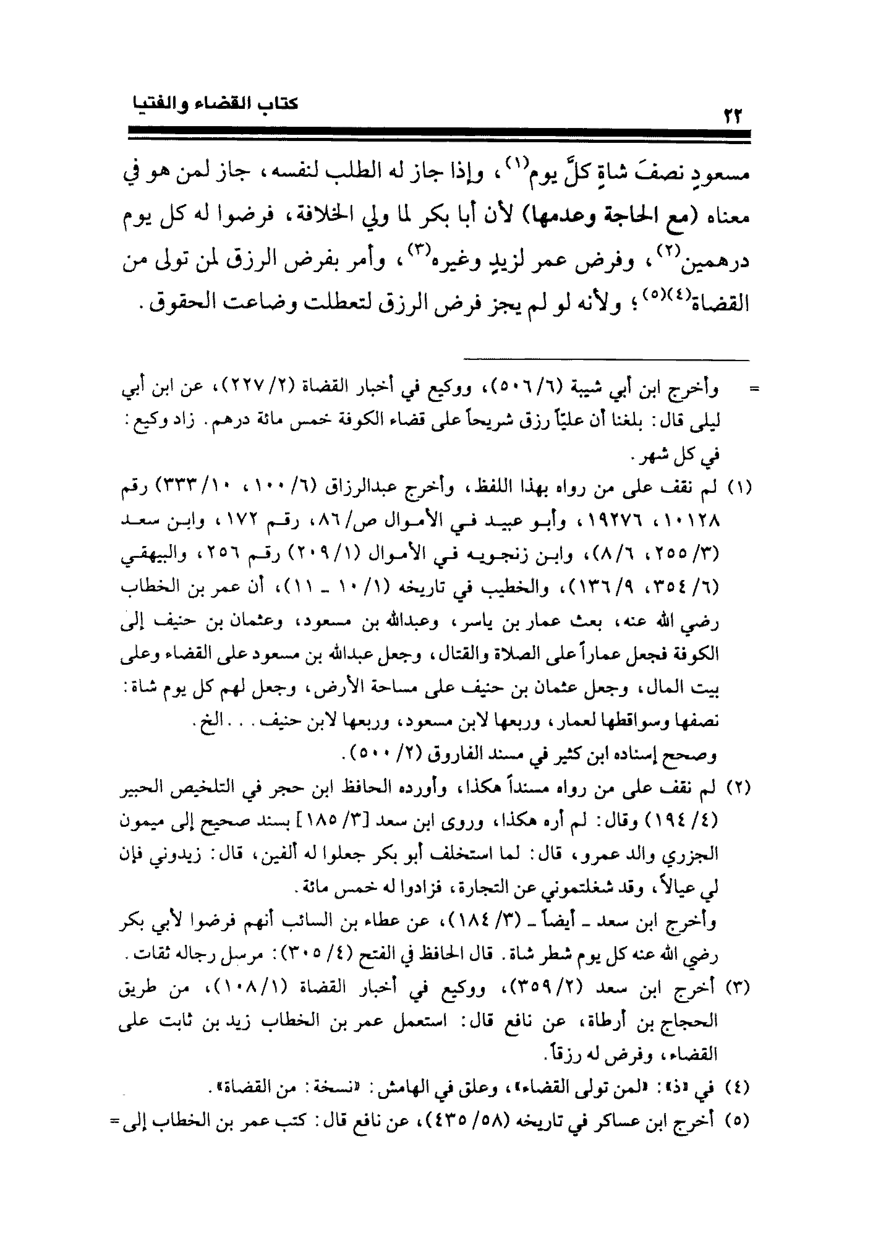 مسعودِ نصفَ شاةِ كلَّ يوم (¬١)، وإذا جاز له الطلب لنفسه، جاز لمن هو في معناه (مع الحاجة وعدمها) لأن أبا بكر لما ولي الخلافة، فرضوا له كل يوم درهمين (¬٢)، وفرض عمر لزيدِ وغيره (¬٣)، وأمر بفرض الرزق لمن تولى من القضاة (¬٤) (¬٥)؛ ولأنه لو لم يجز فرض الرزق لتعطلت وضاعت الحقوق.
