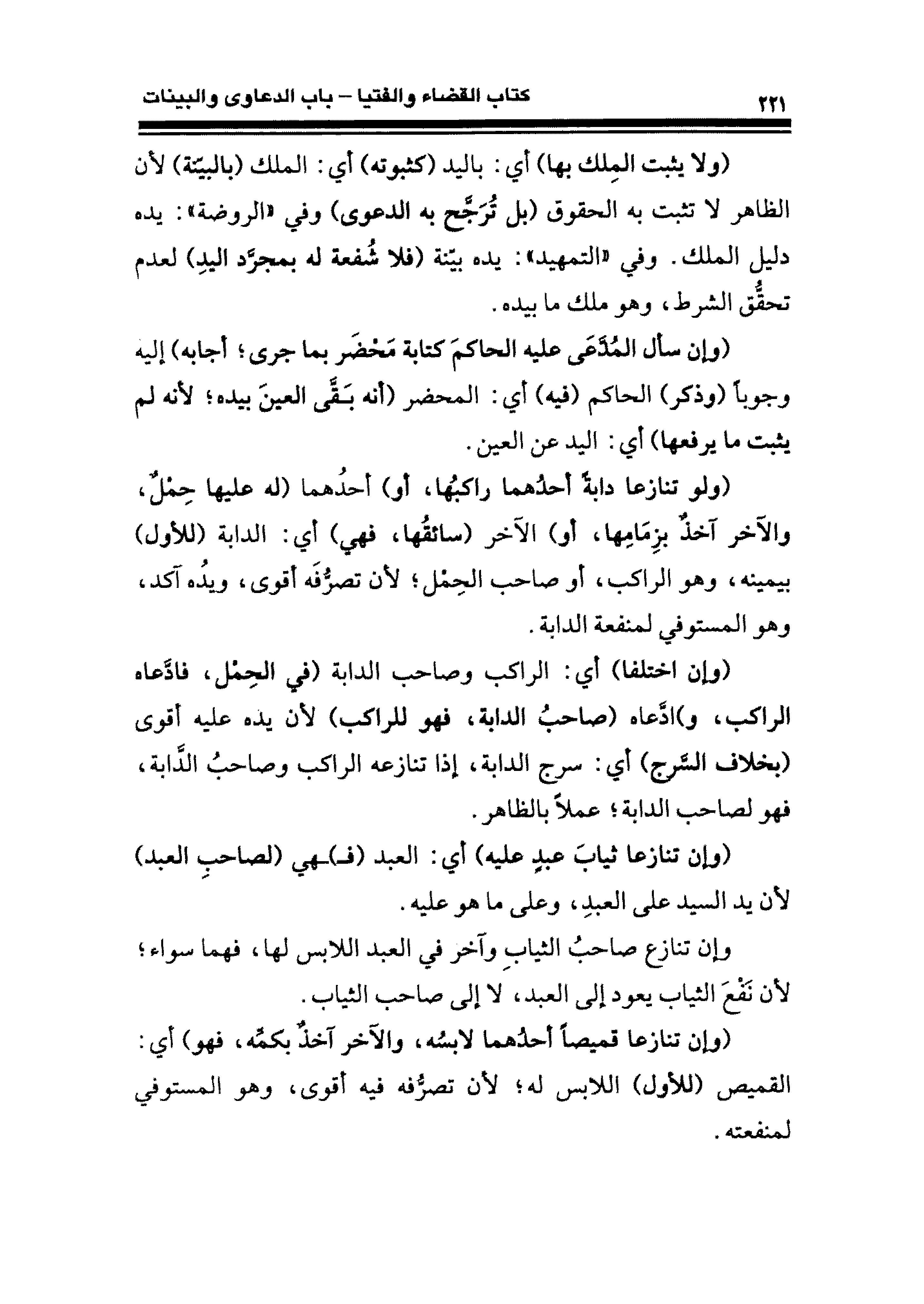 (ولا يثبت الملك بها) أي: باليد (كثبوته) أي: الملك (بالبيّنة) لأن الظاهر لا تثبت به الحقوق (بل تُرَجَّح به الدعوى) وفي "الروضة": يده دليل الملك. وفي "التمهيد": يده بيّنة (فلا شُفعة له بمجرَّد اليدِ) لعدم تحقُّق الشرط، وهو ملك ما بيده.
