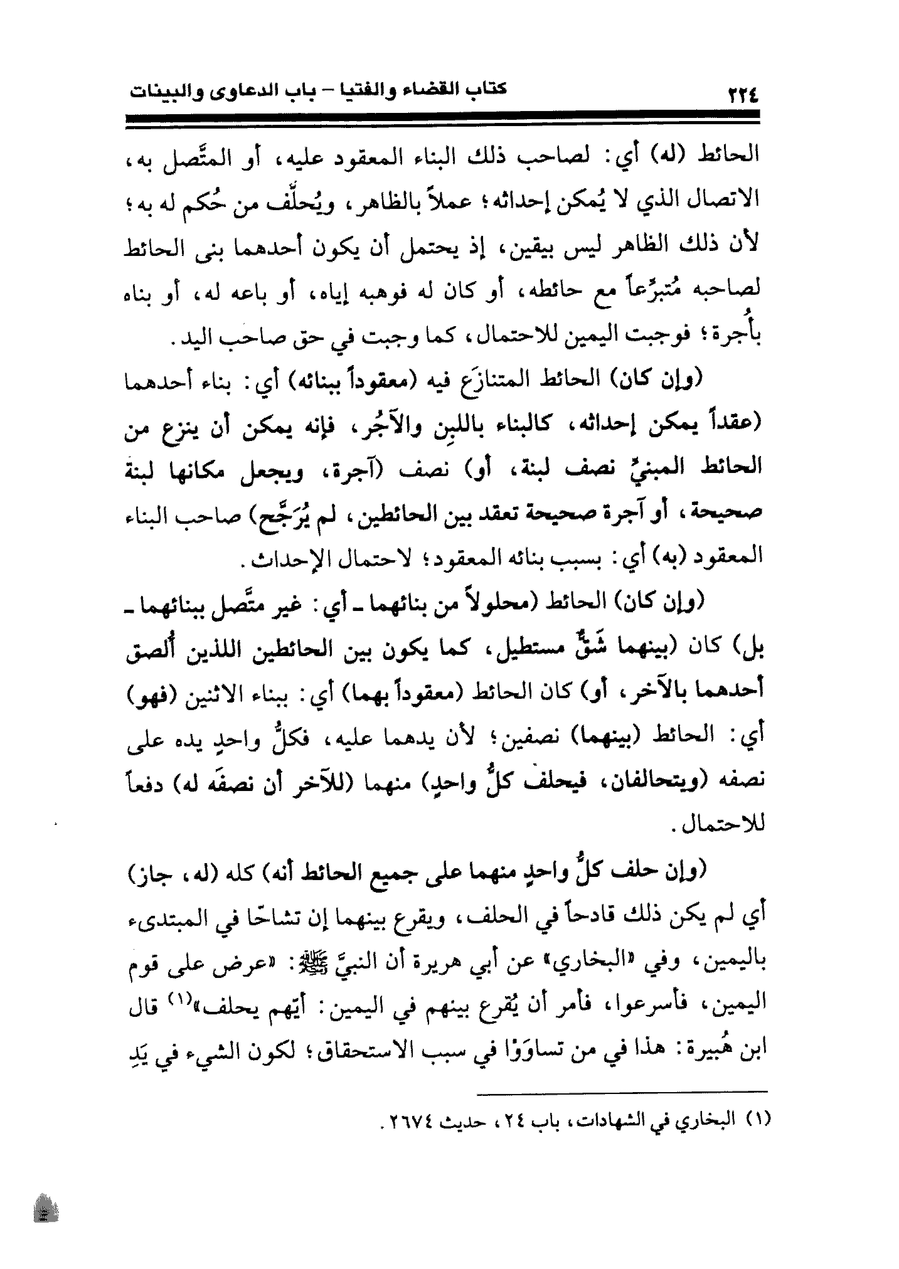 الحائط (له) أي: لصاحب ذلك البناء المعقود عليه، أو المتَّصل به، الاتصال الذي لا يُمكن إحداثه؛ عملًا بالظاهر، ويُحلَّف من حُكم له به؛ لأن ذلك الظاهر ليس بيقين، إذ يحتمل أن يكون أحدهما بنى الحائط لصاحبه مُتبرِّعًا مع حائطه، أو كان له فوهبه إياه، أو باعه له، أو بناه بأُجرة؛ فوجبت اليمين للاحتمال، كما وجبت في حق صاحب اليد.