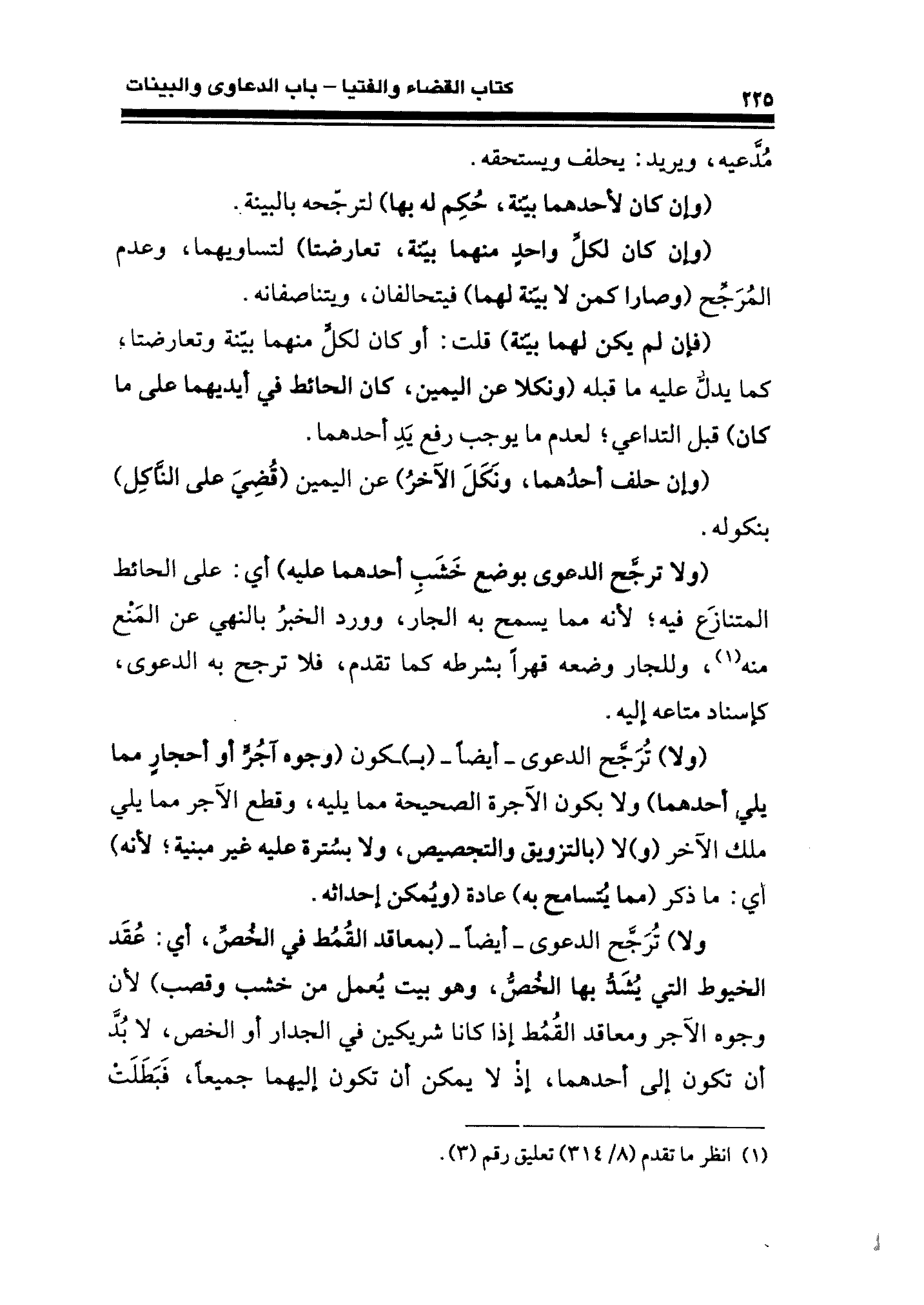 ولا) تُرَجَّح الدعوى -أيضًا- (بمعاقد القُمُط في الخُصِّ، أي: عُقَد الخيوط التي يُشَدُ بها الخُصُّ، وهو بيت يُعمل من خشب وقصب) لأن وجوه الآجر ومعاقد القُمُط إذا كانا شريكين في الجدار أو الخص، لا بُدَّ أن تكون إلى أحدهما، إذْ لا يمكن أن تكون إليهما جميعًا، فَبَطَلَتْ