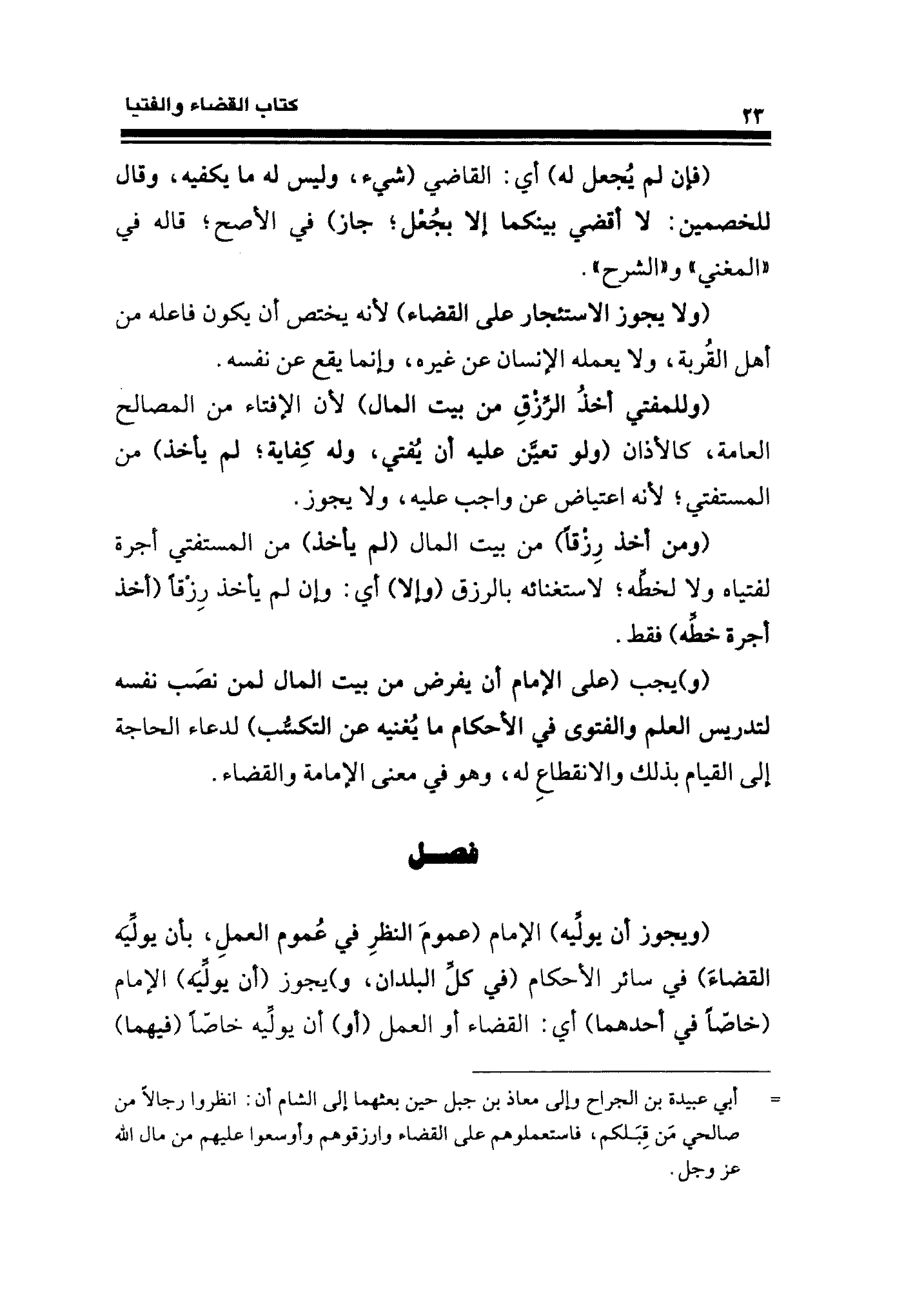 = أبي عبيدة بن الجراح وإلى معاذ بن جبل حين بعثهما إلى الشام أن: انظروا رجالًا من صالحي مَن قِبَلكم، فاستعملوهم على القضاء وارزقوهم وأوسعوا عليهم من مال الله عز وجل.