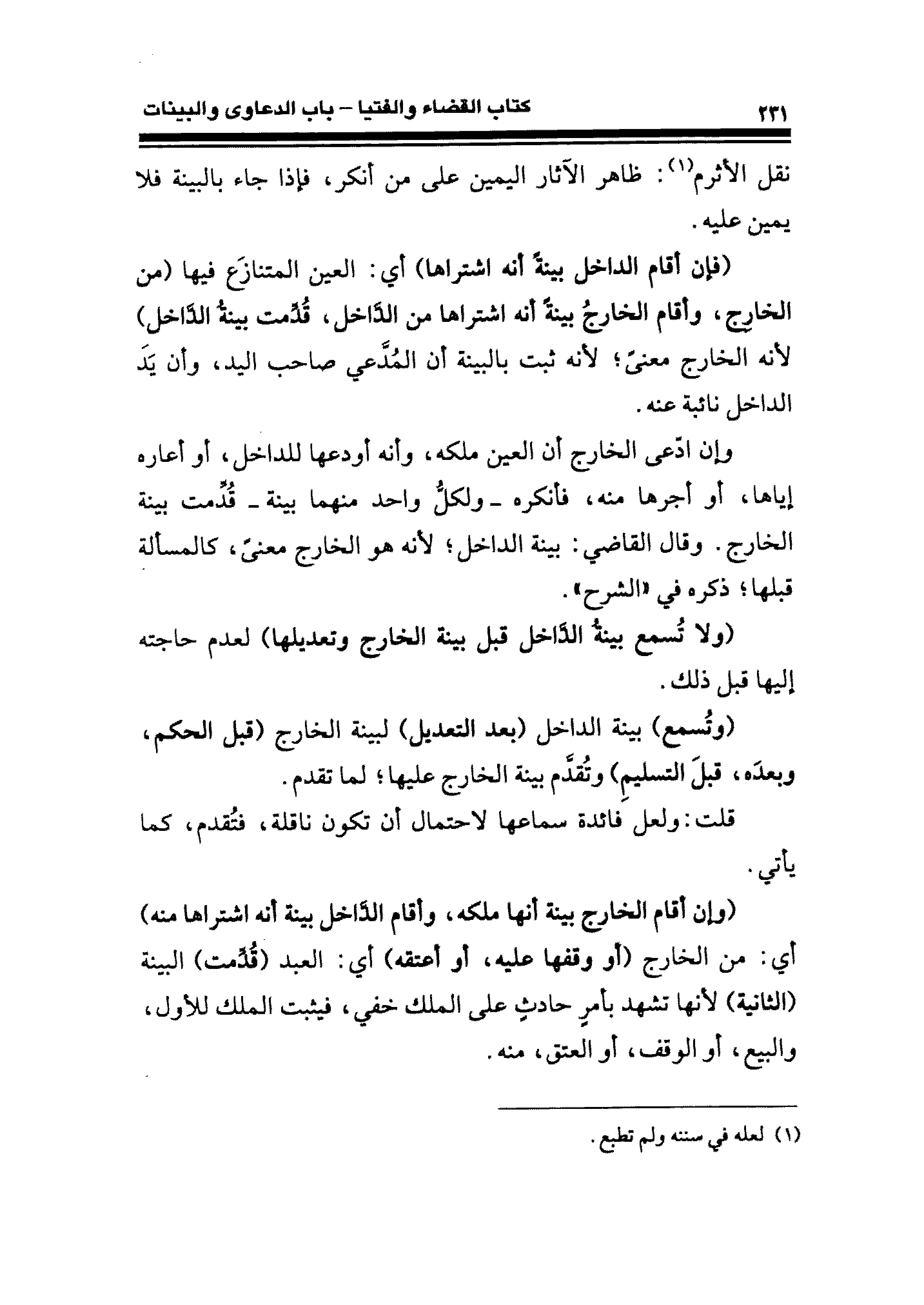 (فإن أقام الداخل بينةً أنَّه اشتراها) أي: العين المتنازَع فيها (من الخارج، وأقام الخارجُ بينةً أنَّه اشتراها من الدَّاخل، قُدِّمت بينةُ الدَّاخل) لأنه الخارج معنىً؛ لأنه ثبت بالبينة أن المُدَّعي صاحب اليد، وأن يَدَ الداخل نائبة عنه.