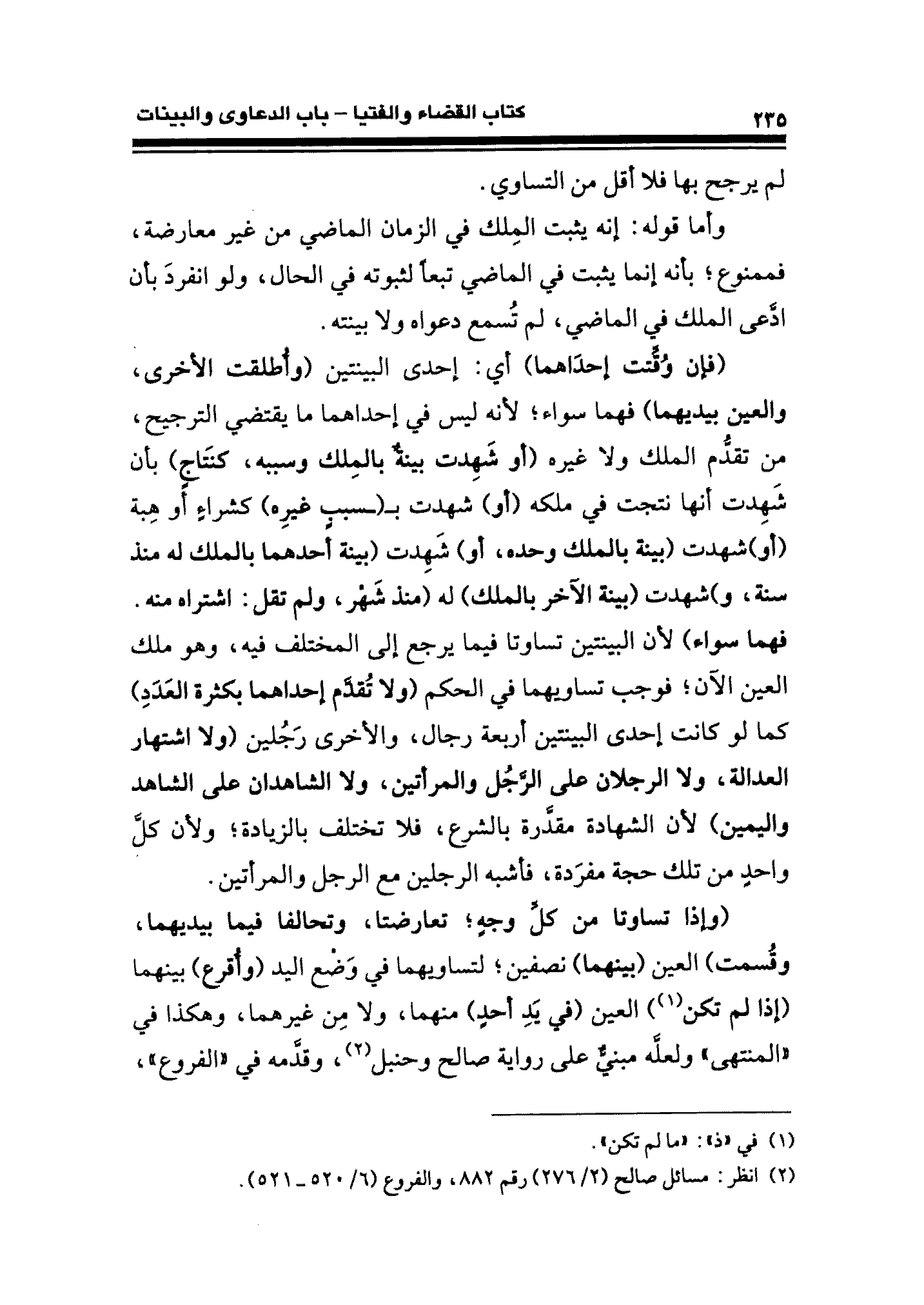 (فإن وُقِّتت إحدَاهما) أي: إحدى البينتين (وأطلقت الأخرى، والعين بيديهما) فهما سواء؛ لأنه ليس في إحداهما ما يقتضي الترجيح، من تقدم الملك ولا غيره (أو شَهِدت بينةٌ بالمِلك وسببه، كنتَاج) بأن شَهِدت أنها نتجت في ملكه (أو) شهدت بـ (ـسبب غيرِه) كشراءٍ أَو هِبة (أو) شهدت (بينة بالملك وحده، أو) شَهِدت (بينة أحدهما بالملك له منذ سنة، و) شهدت (بينة الآخر بالملك) له (منذ شَهر، ولم تقل: اشتراه منه. فهما سواء) لأن البينتين تَساوتا فيما يرجع إلى المختلف فيه، وهو ملك العين الآن؛ فوجب تساويهما في الحكم (ولا تُقدَّم إحداهما بكثرة العَدَدِ) كما لو كانت إحدى البينتين أربعة رجال، والأخرى رَجُلين (ولا اشتهار العدالة، ولا الرجلان على الرَّجُل والمرأتين، ولا الشاهدان على الشاهد واليمين) لأن الشهادة مُقدَّرة بالشرع، فلا تختلف بالزيادة؛ ولأن كلَّ واحدٍ من تلك حجة مفرَدة، فأشبه الرجلين مع الرجل والمرأتين.