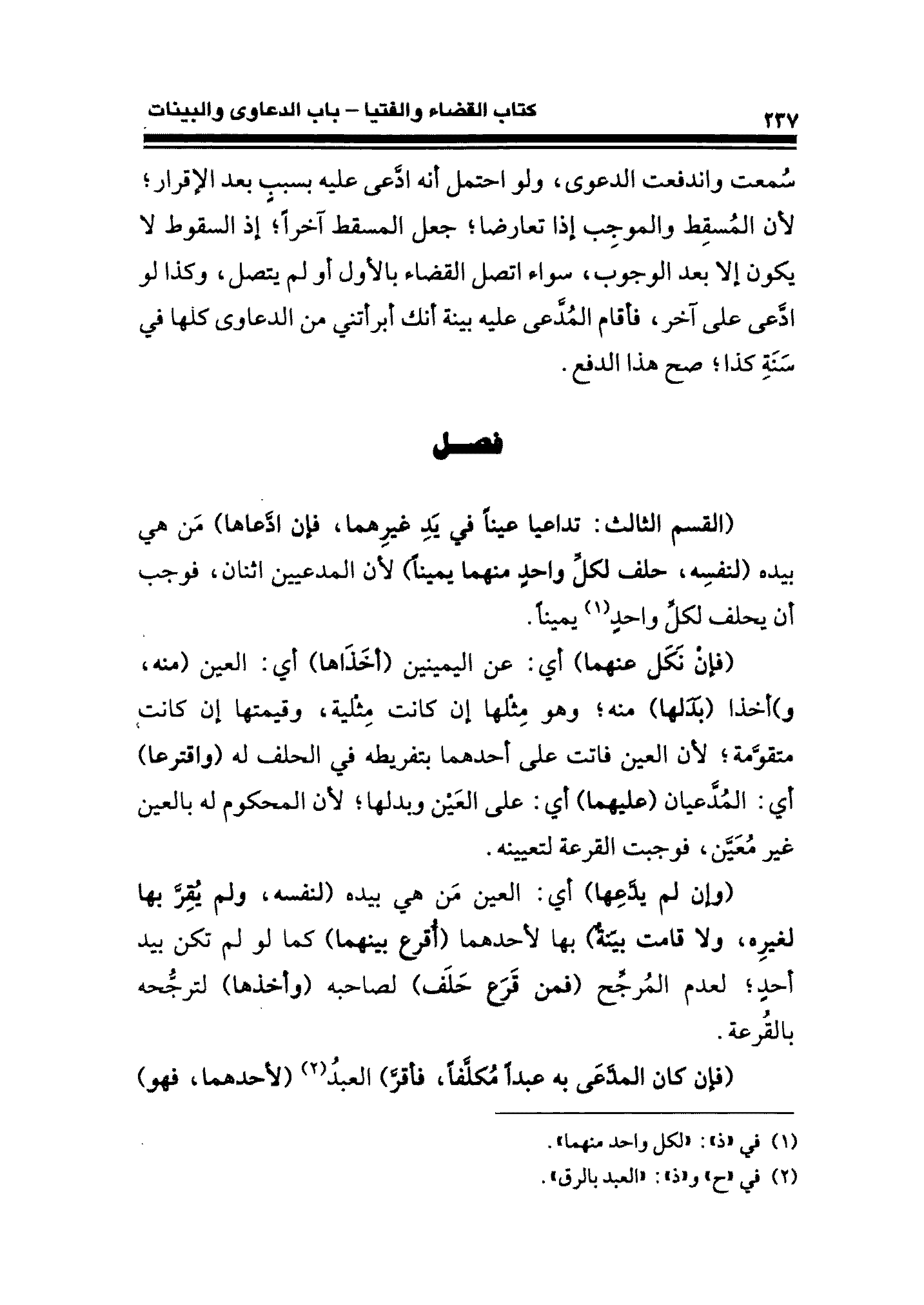(فإن نَكَل عنهما) أي: عن اليمينين (أخَذَاها) أي: العين (منه، و) أخذا (بَدَلها) منه؛ وهو مِثْلها إن كانت مِثلية، وقيمتها إن كانت متقوَّمة؛ لأن العين فاتت على أحدهما بتفريطه في الحلف له (واقترعا) أي: المدَّعيان (عليهما) أى: على العَين وبدلها؛ لأن المحكوم له بالعين غير مُعَيَّن، فوجبت القرعة لتعيينه.
