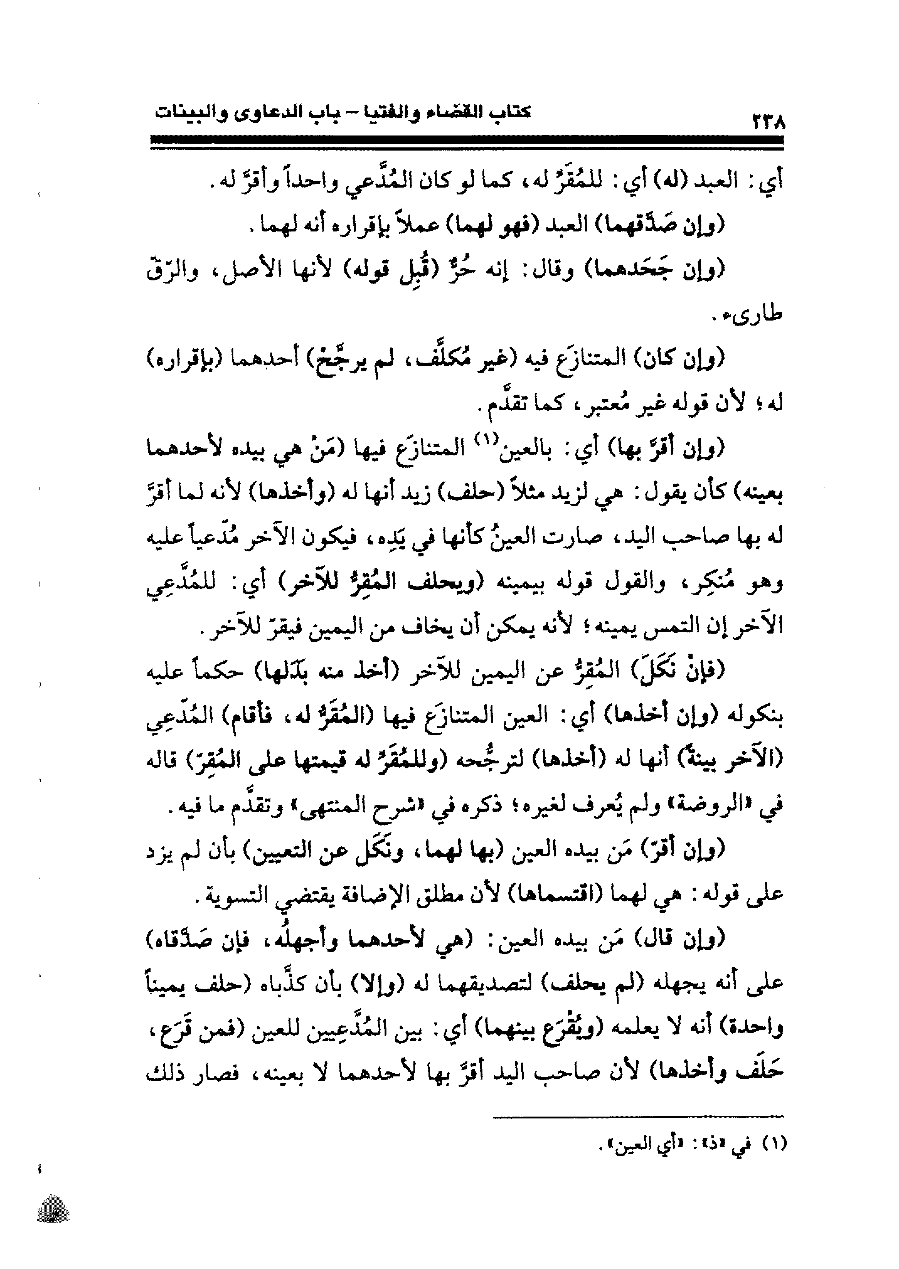 (فإن نكَلَ) المُقِرُّ عن اليمين للآخر (أخذ منه بَدَلها) حكمًا عليه بنكوله (وإن أخذها) أي: العين المتنازع فيها (المُقَرُّ له، فأقام) المُدَّعِي (الآخر بينةً) أنها له (أخذها) لترجُّحه (وللمُقَرِّ له قيمتها على المُقِرّ) قاله في "الروضة" ولم يُعرف لغيره؛ ذكره في "شرح المنتهى" وتقدَّم ما فيه.