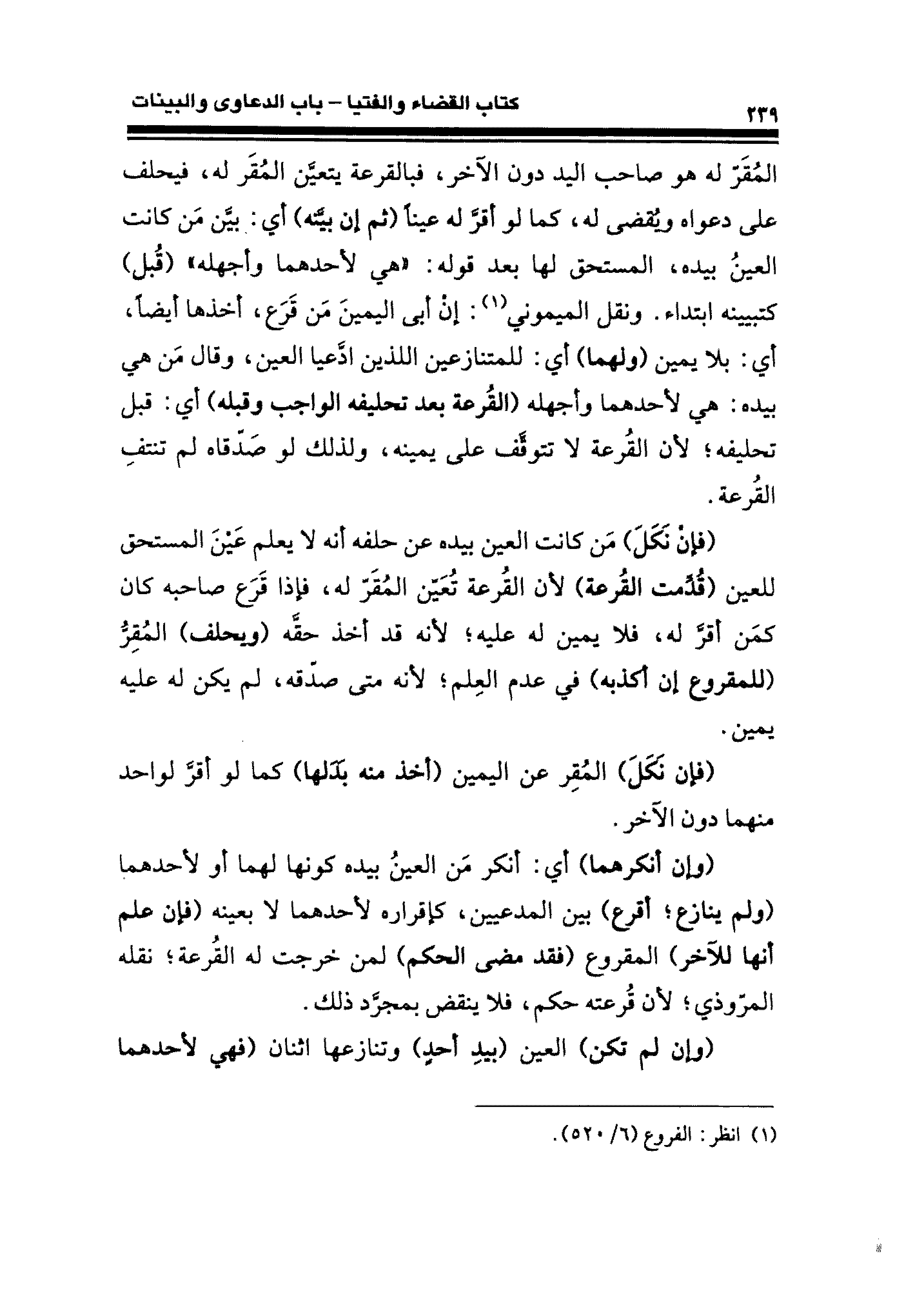 المُقَرّ له هو صاحب اليد دون الآخر، فبالقرعة يتعيَّن المُقَر له، فيحلف على دعواه ويُقضى له، كما لو أقرَّ له عينًا (ثم إن بيَّنه) أي: بيَّن مَن كانت العينُ بيده، المستحق لها بعد قوله: "هي لأحدهما وأجهله" (قبل) كتبيينه ابتداء. ونقل الميموني (¬١): إن أبى اليمينَ مَن قَرَع، أخذها أيضًا، أي: بلا يمين (ولهما) أي: للمتنازعين اللذين ادَّعيا العين، وقال مَن هي بيده: هي لأحدهما وأجهله (القُرعة بعد تحليفه الواجب وقبله) أي: قبل تحليفه؛ لأن القُرعة لا تتوقَّف على يمينه، ولذلك لو صَدَّقاه لم تنتفِ القُرعة.