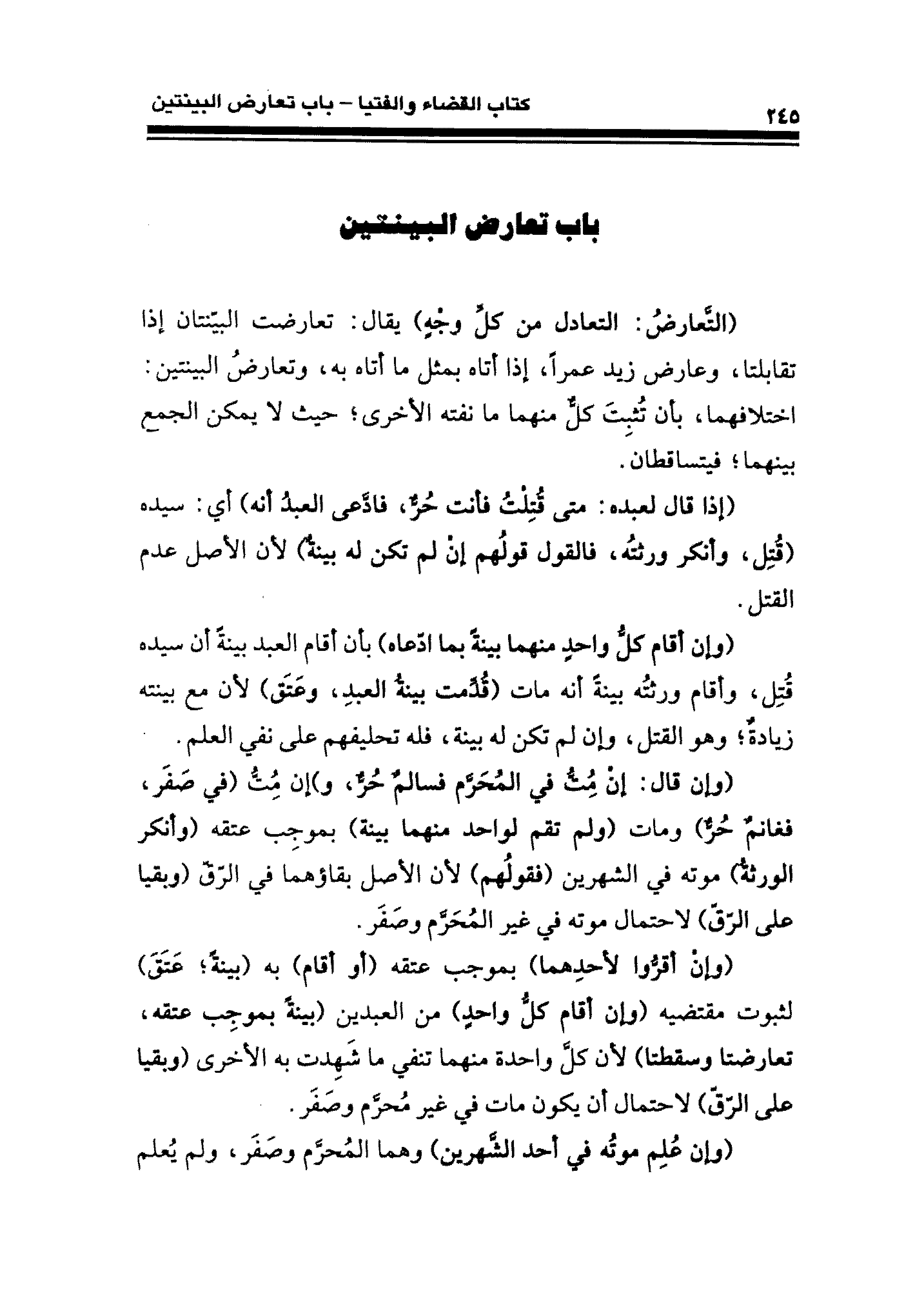 (التَّعارضُ: التعادل من كلِّ وجْهٍ) يقال: تعارضت البيّنتان إذا تقابلتا، وعارض زيد عمرًا، إذا أتاه بمثل ما أتاه به، وتعارضُ البينتين: اختلافهما، بأن تُثبِتَ كلٌّ منهما ما نفته الأخرى؛ حيث لا يمكن الجمع بينهما؛ فيتساقطان.