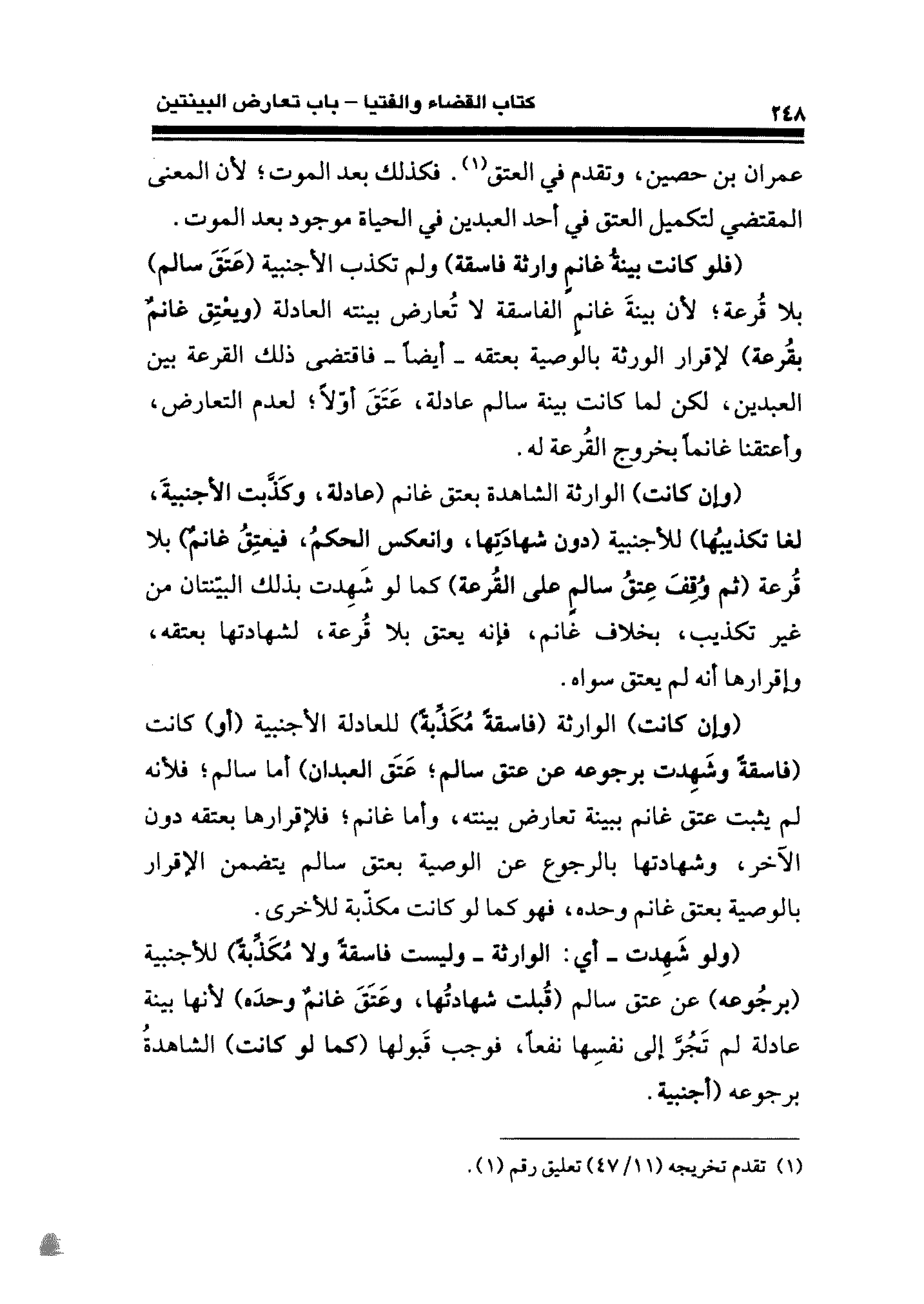 (وإن كانت) الوارثة الشاهدة بعتق غانم (عادلة، وكَذَّبت الأجنبيةَ، لغا تكذيبُها) للأجنبية (دون شهادَتِها، وانعكس الحكمُ، فيعتِقُ غانمٌ) بلا قُرعة (ثم وُقِفَ عِتقُ سالمٍ على القُرعة) كما لو شَهِدت بذلك البيّنتان من غير تكذيب، بخلاف غانم، فإنه يعتق بلا قُرعة، لشهادتها بعتقه، وإقرارها أنه لم يعتق سواه.