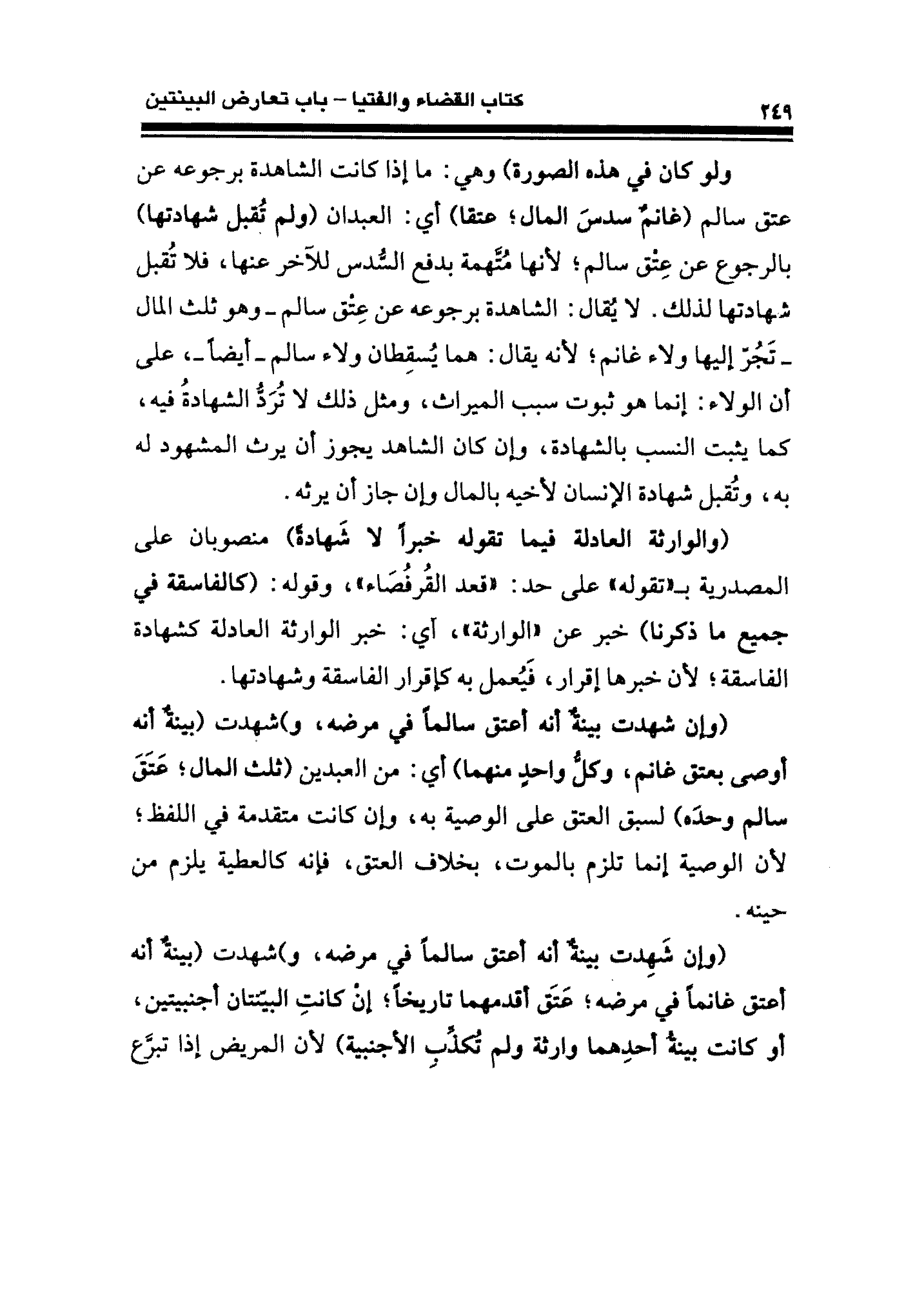 ولو كان في هذه الصورة) وهي: ما إذا كانت الشاهدة برجوعه عن عتق سالم (غانمٌ سدسَ المال؛ عتقا) أي: العبدان (ولم تُقبل شهادتها) بالرجوع عن عِتْق سالم؛ لأنها مُتَّهمة بدفع السُّدس للآخر عنها، فلا تُقبل شهادتها لذلك. لا يُقال: الشاهدة برجوعه عن عِتْق سالم -وهو ثلث المال- تَجُرّ إليها ولاء غانم؛ لأنه يقال: هما يُسقِطان ولاء سالم -أيضًا-، على أن الولاء: إنما هو ثبوت سبب الميراث، ومثل ذلك لا تُرَدُّ الشهادةُ فيه، كما يثبت النسب بالشهادة، وإن كان الشاهد يجوز أن برث المشهود له به، وتُقبل شهادة الإنسان لأخيه بالمال وإن جاز أن يرثه.