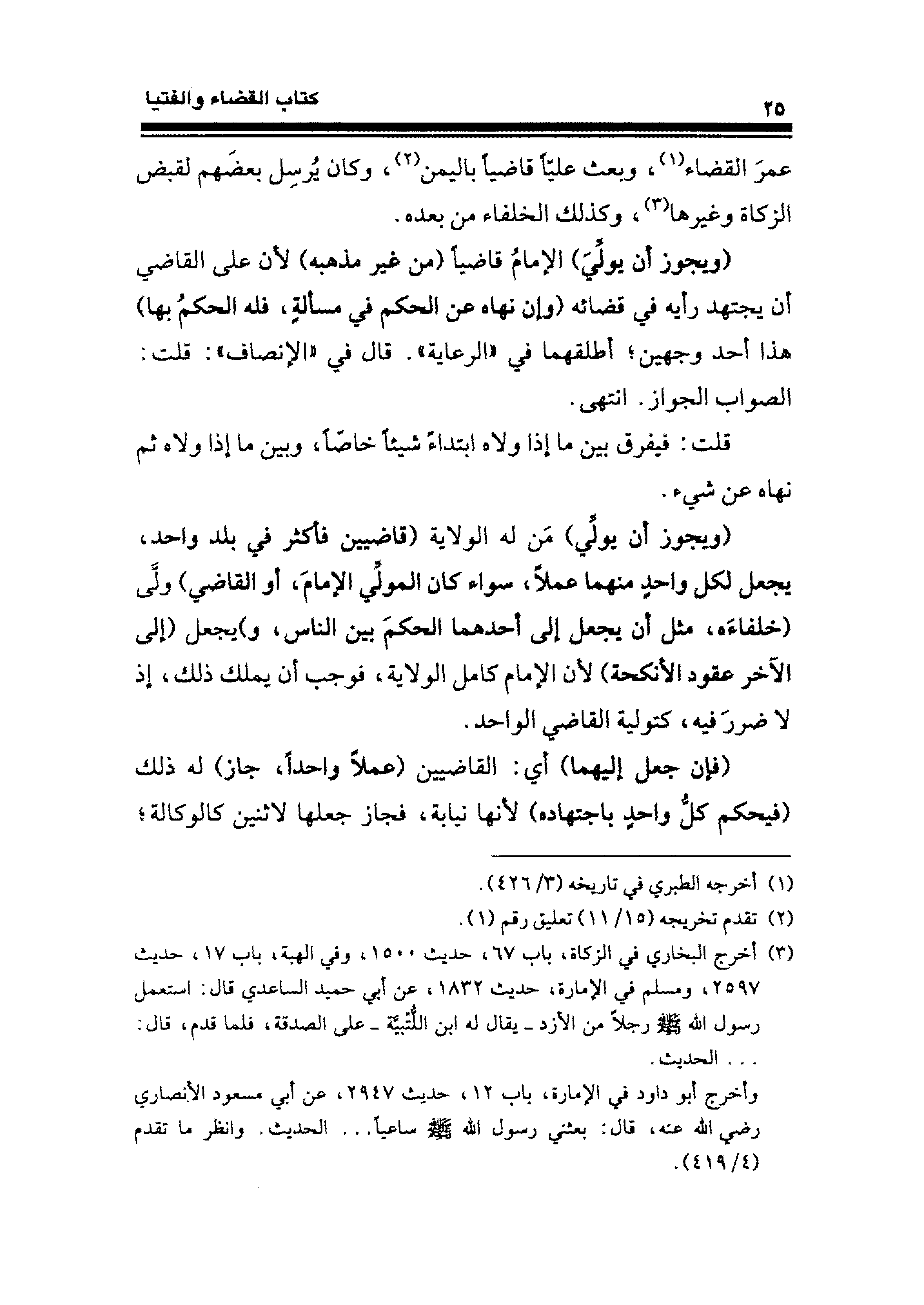 عمرَ القضاء (¬١)، وبعث عليًّا قاضيًا باليمن (¬٢)، وكان يُرسِل بعضَهم لقبض الزكاة وغيرها (¬٣)، وكذلك الخلفاء من بعده.